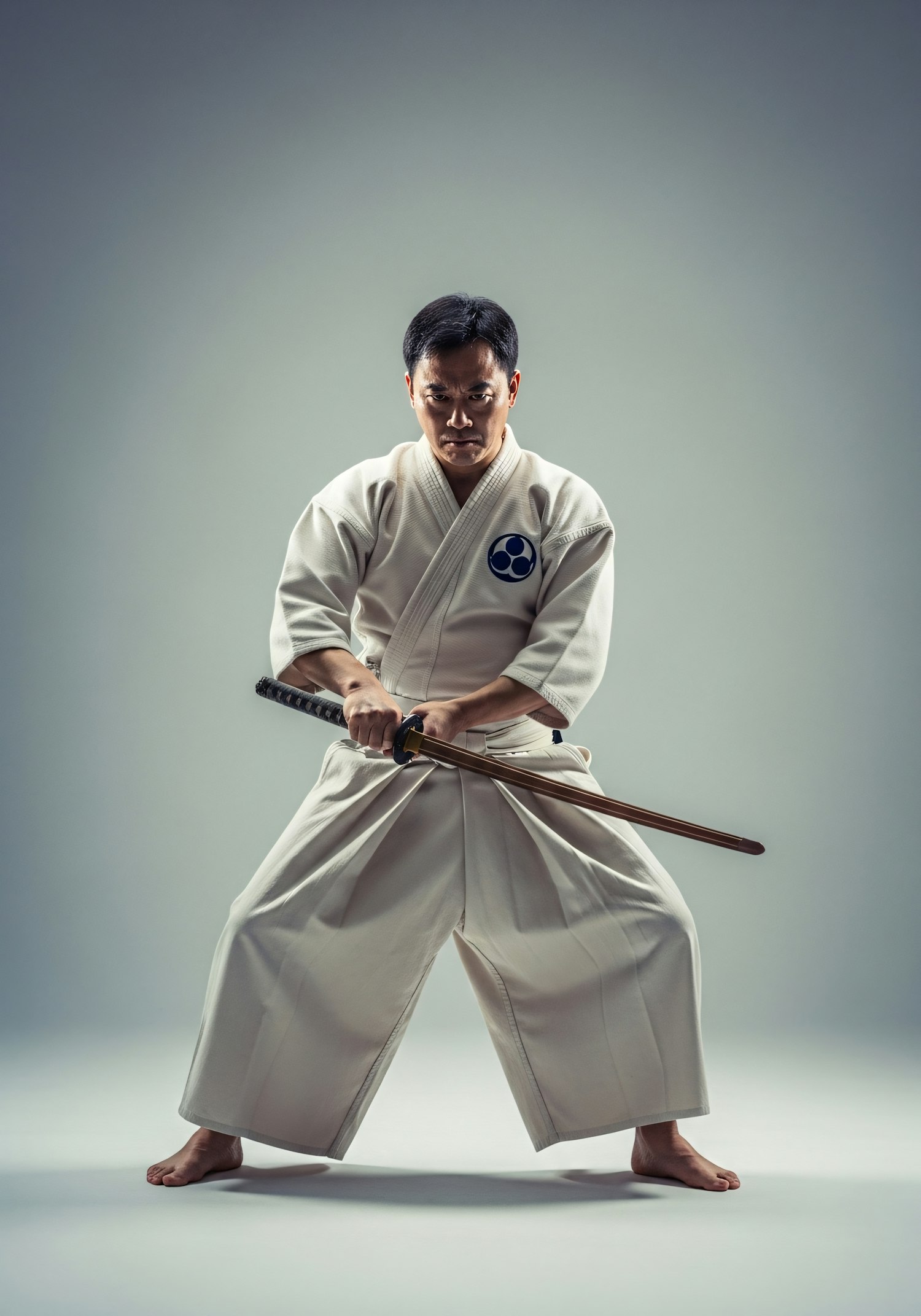 A martial artist in a white uniform holds a katana in a focused stance, showcasing discipline and traditional martial arts attire.