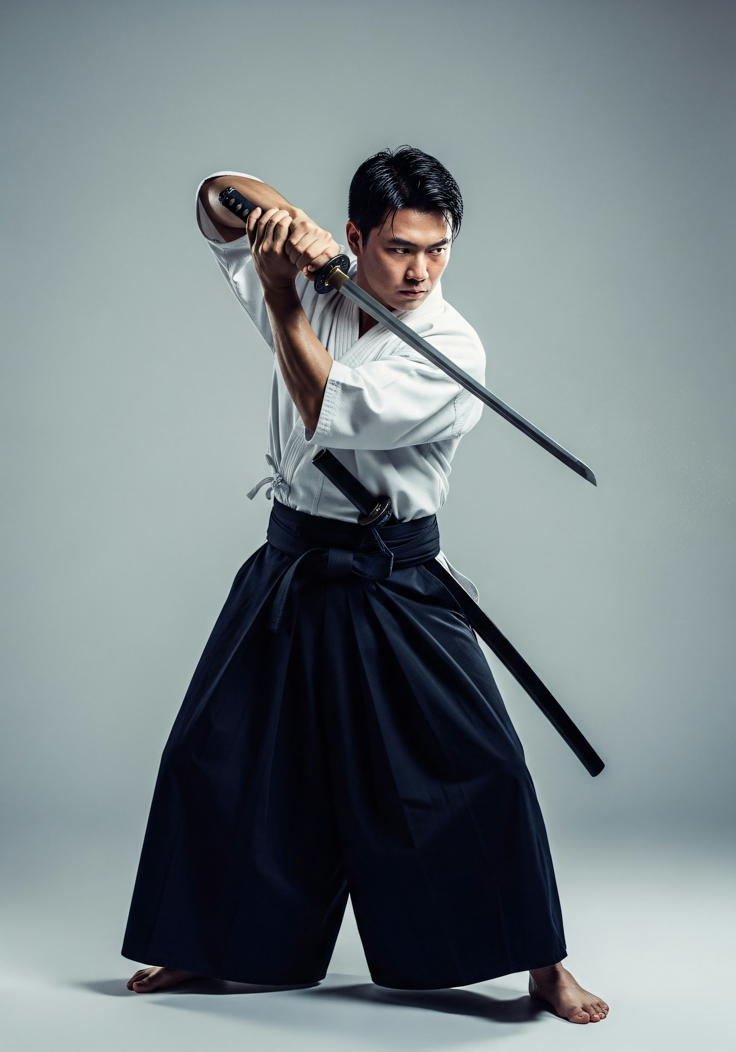 A martial artist in traditional attire holds a katana in a poised stance, showcasing focus and discipline against a neutral background.