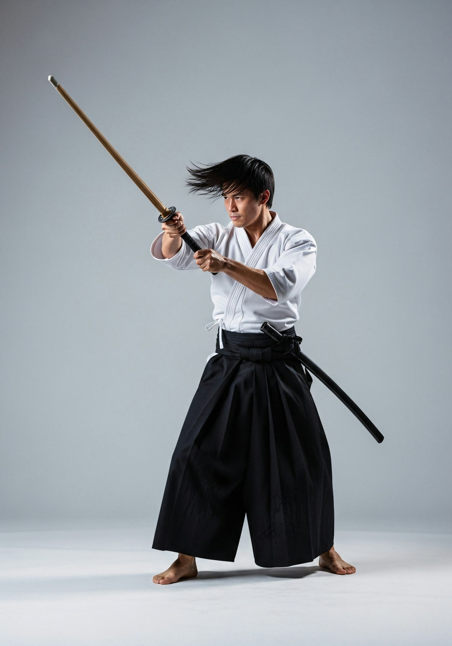 A martial artist in traditional attire demonstrates a dynamic pose with a wooden sword, showcasing skill and precision.
