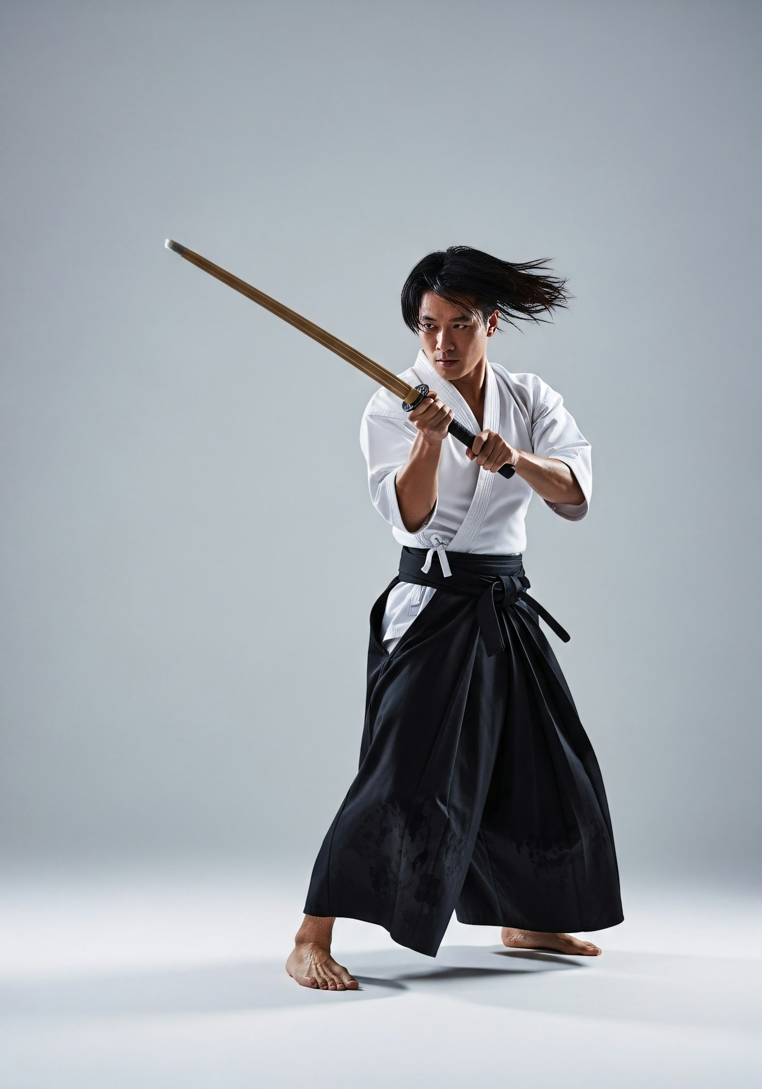 A martial artist in traditional attire demonstrates a poised stance with a wooden sword, showcasing focus and skill in a dynamic pose.
