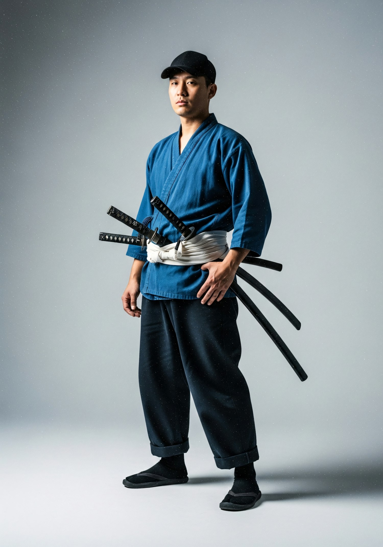 A man in martial arts attire with a white belt and three swords, standing confidently in a neutral studio setting.