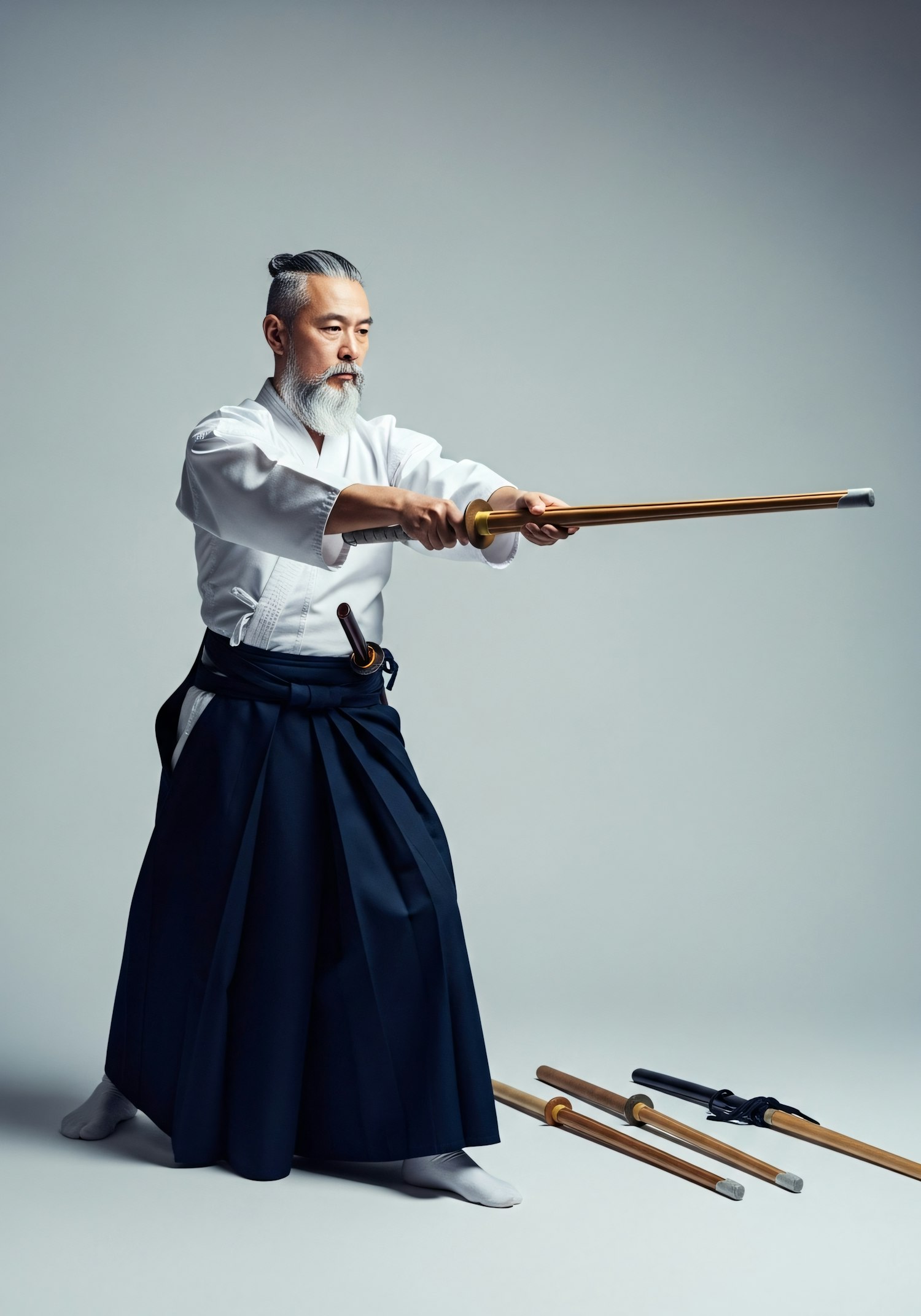 A martial artist in traditional attire practices with a wooden sword, surrounded by training tools, in a serene and focused setting.