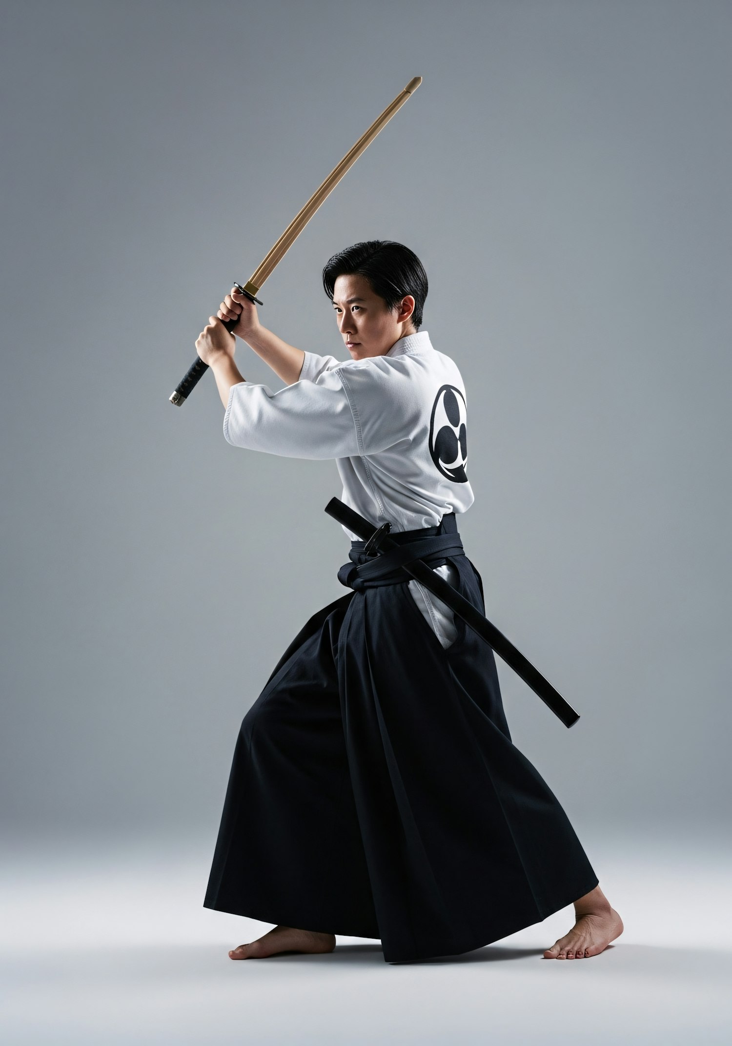 A martial artist in traditional attire holds a wooden sword in a poised stance, showcasing focus and discipline against a neutral background.