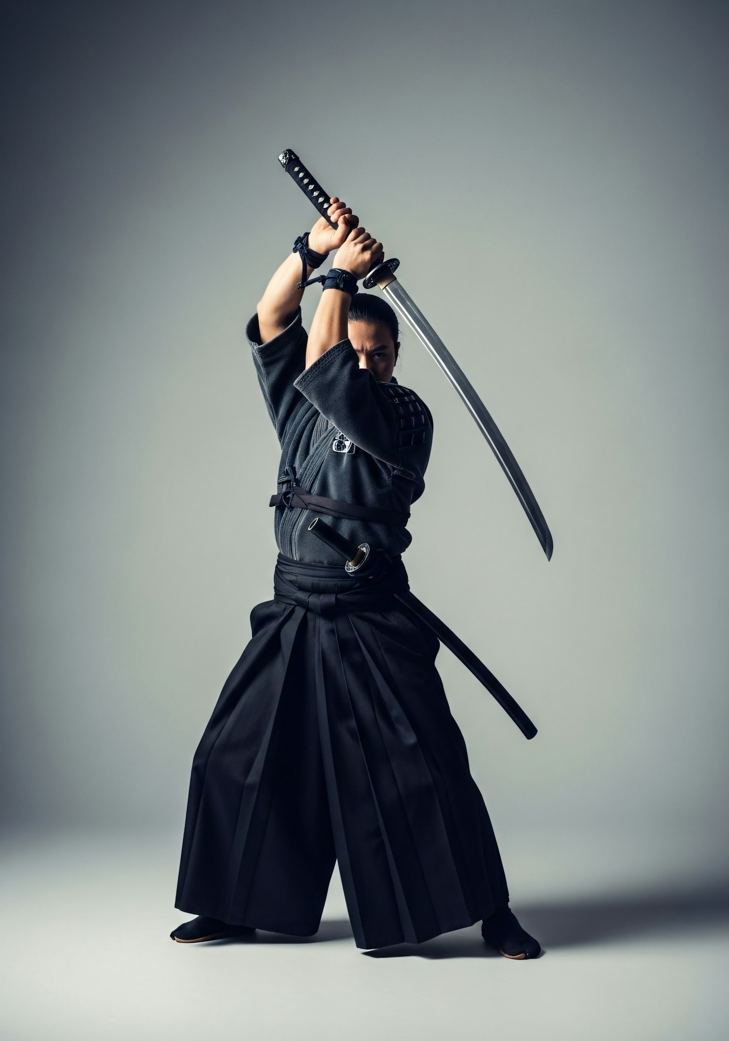 A martial artist in traditional attire poses with a katana, showcasing skill and precision in a neutral studio setting.