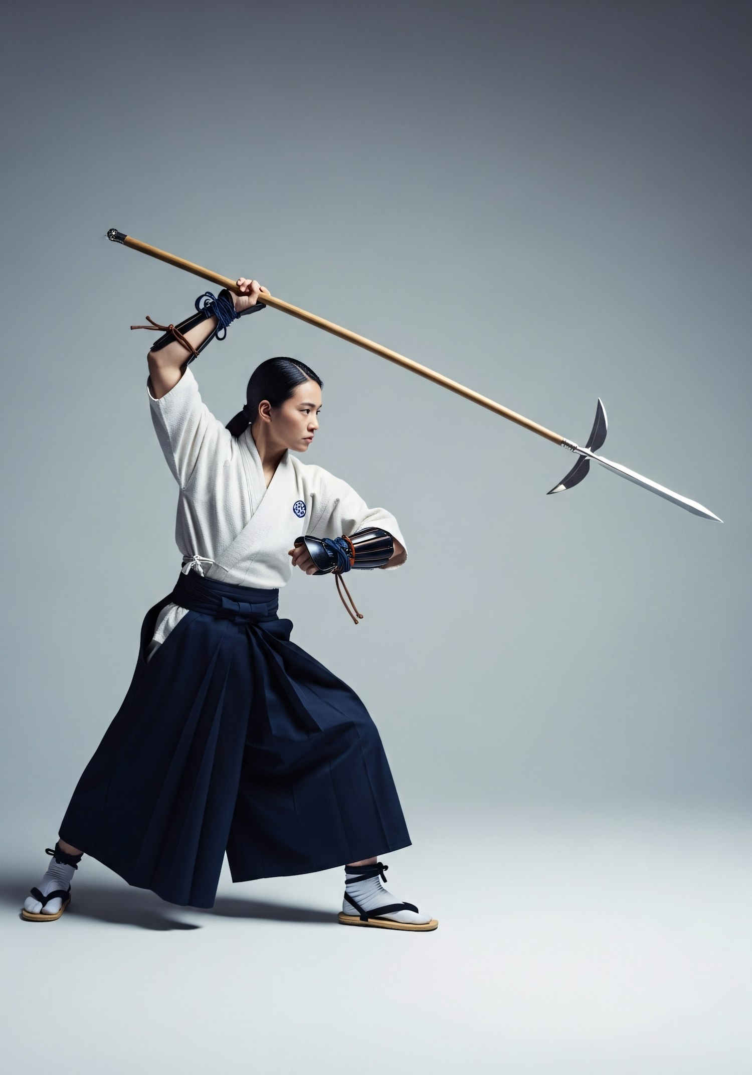 A martial artist in traditional attire poses with a polearm, showcasing skill and precision against a neutral background.