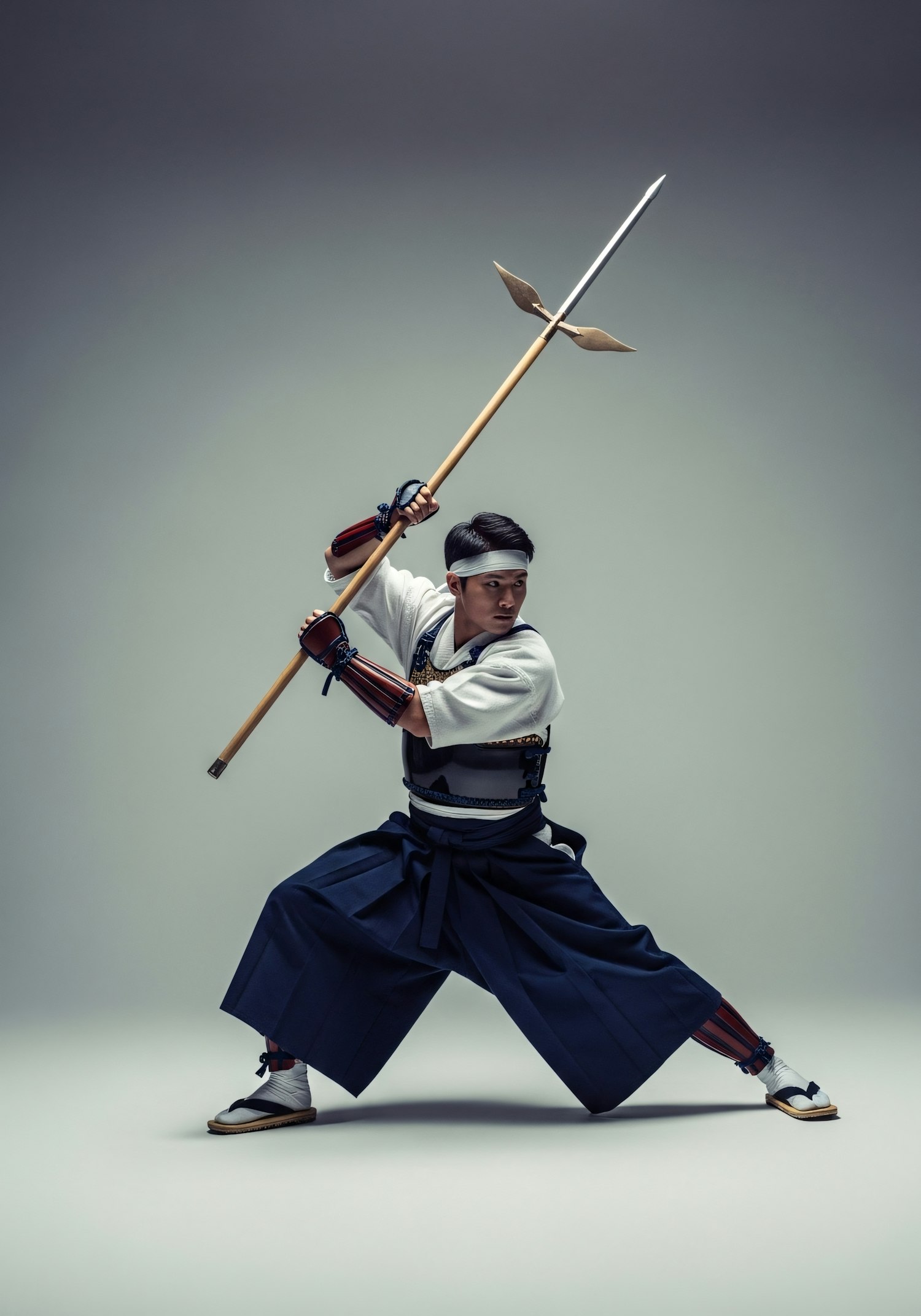 A martial artist in traditional Japanese attire poses dynamically with a yari spear, showcasing skill and focus against a neutral background.