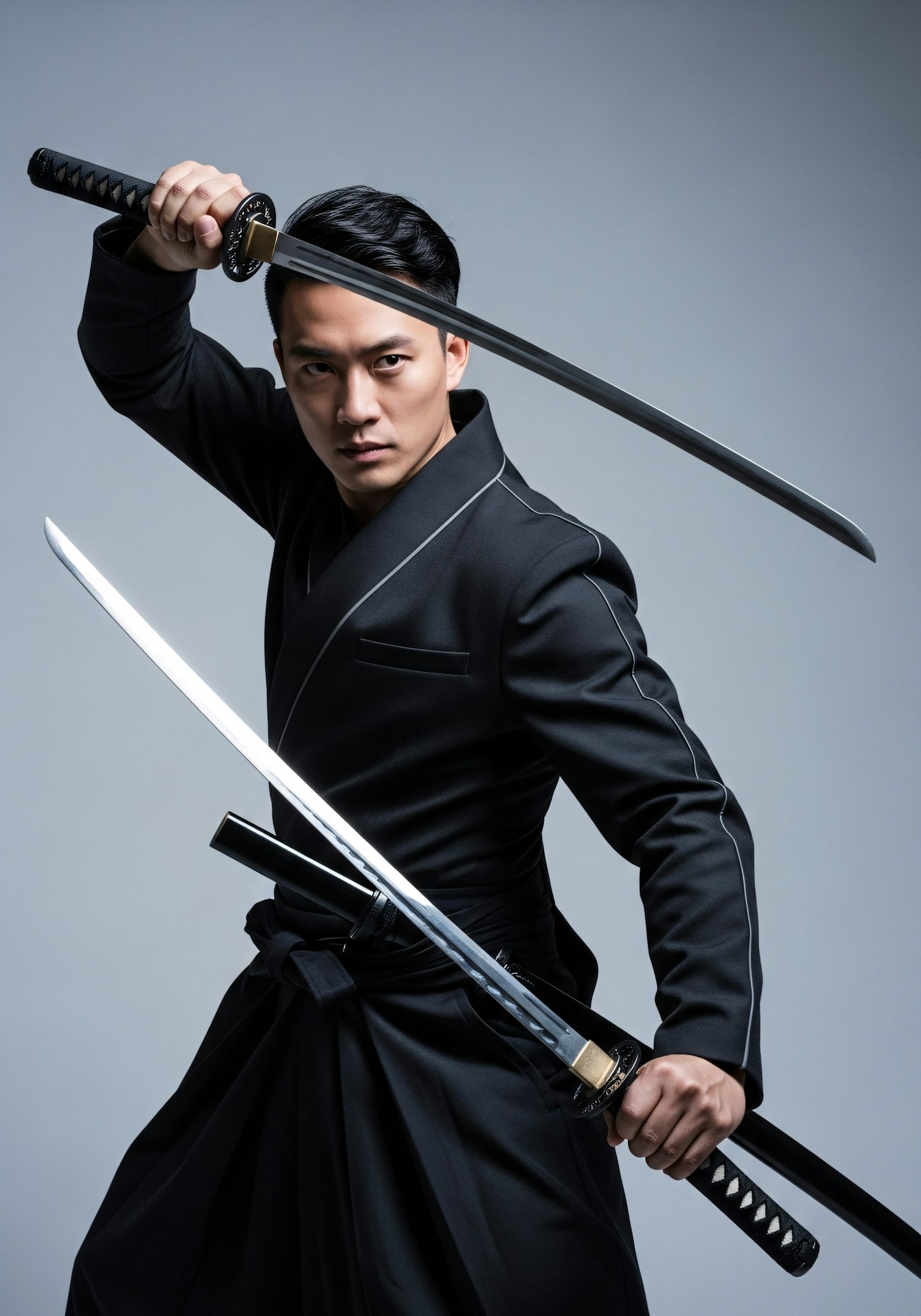 A martial artist in a black uniform holds two katanas in a poised stance, showcasing skill and focus against a neutral background.
