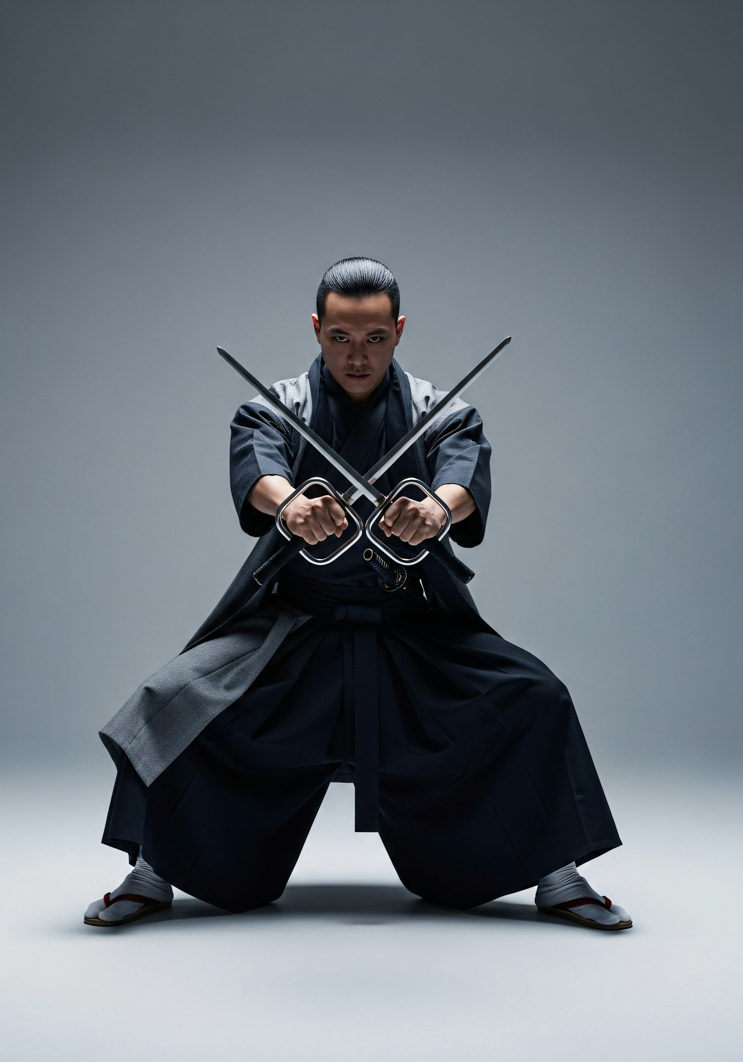 A martial artist in traditional attire poses with crossed swords, showcasing skill and focus in a minimalist setting.