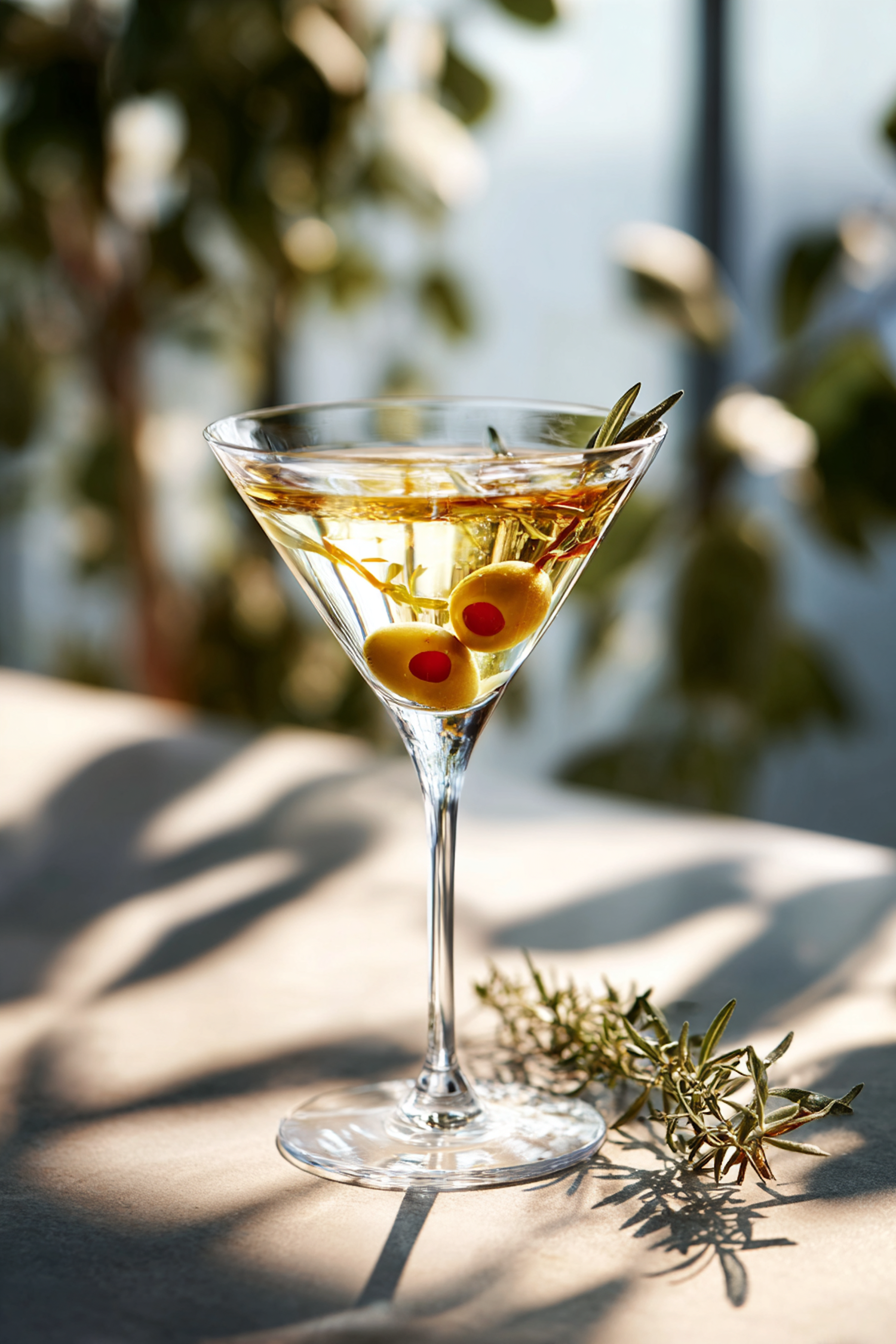 A classic martini with olives and rosemary garnish in a sunlit setting, perfect for a refreshing and elegant cocktail moment.
