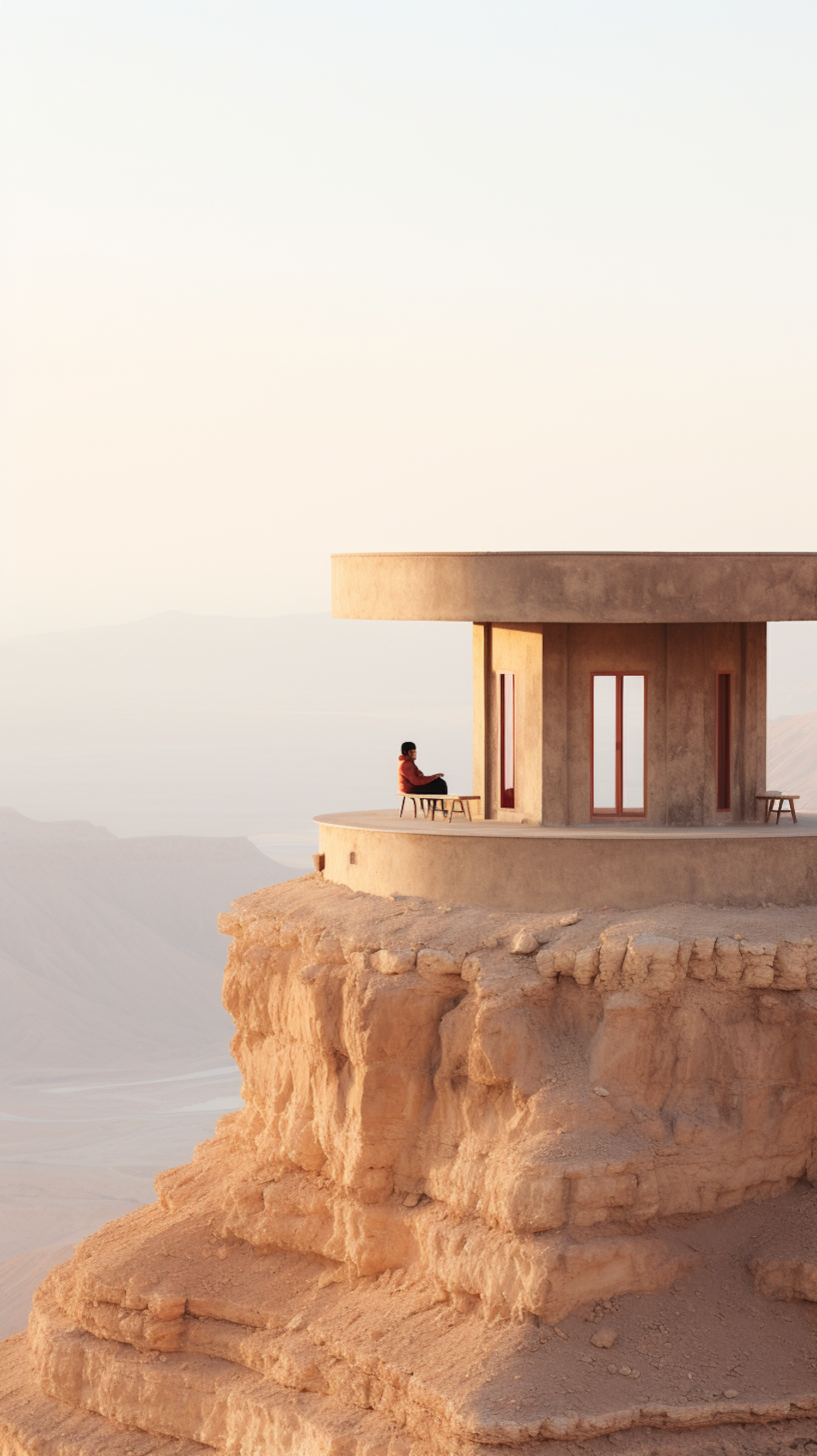 Modern circular building on a cliff with a person seated outside, overlooking a serene desert landscape at dawn or dusk.