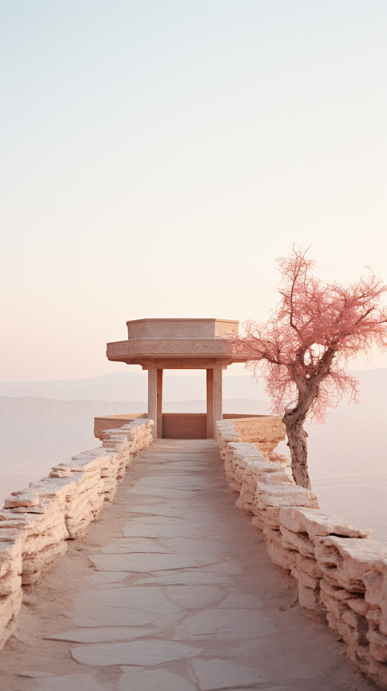 Stone pathway leads to a minimalist structure with a pink tree, set against a pastel sky and distant hills.