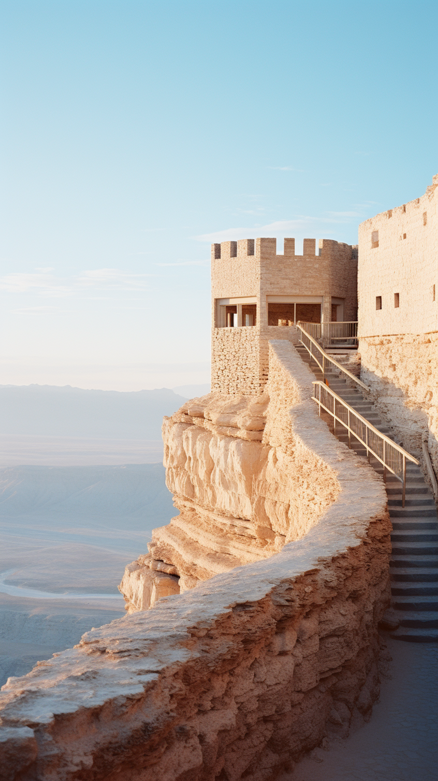 Stone fortress perched on a cliff with a winding path, overlooking a vast desert landscape under a clear blue sky.
