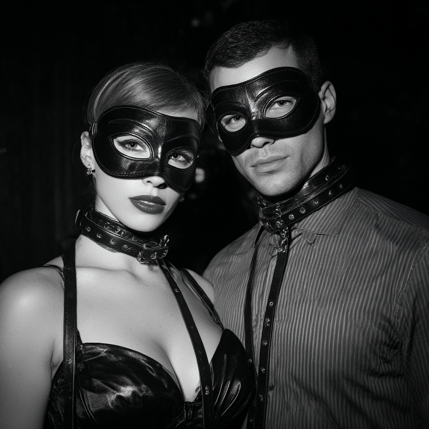 Black-and-white photo of two individuals in leather masks and collars, showcasing a bold and striking aesthetic.