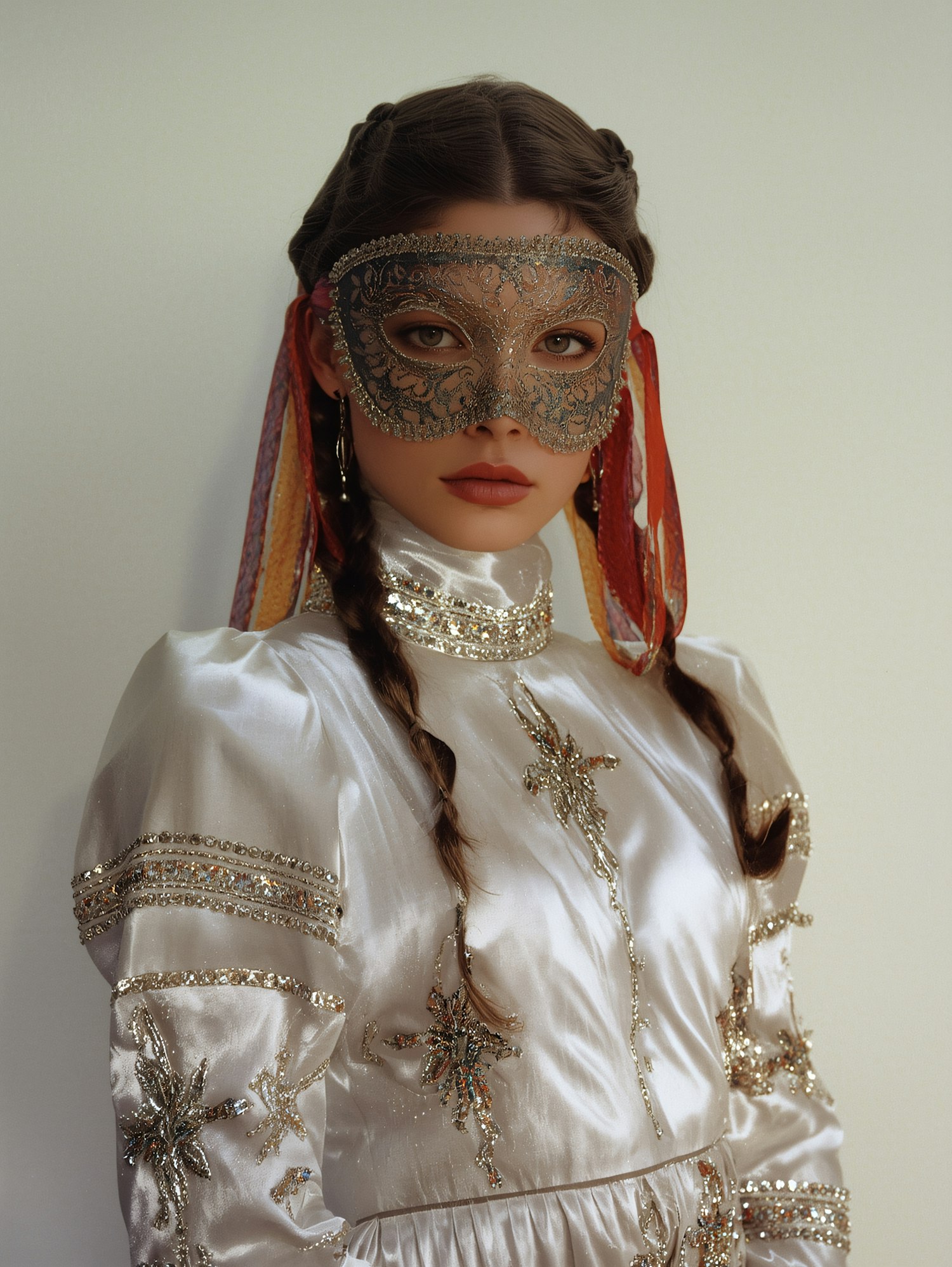 A woman in a white satin gown with intricate embroidery and a metallic lace mask, styled with braided hair and colorful ribbons.