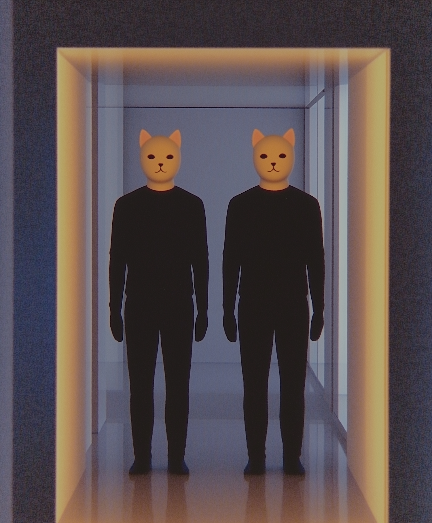 Two masked figures in black stand in a futuristic hallway with warm lighting, creating a surreal and mysterious atmosphere.