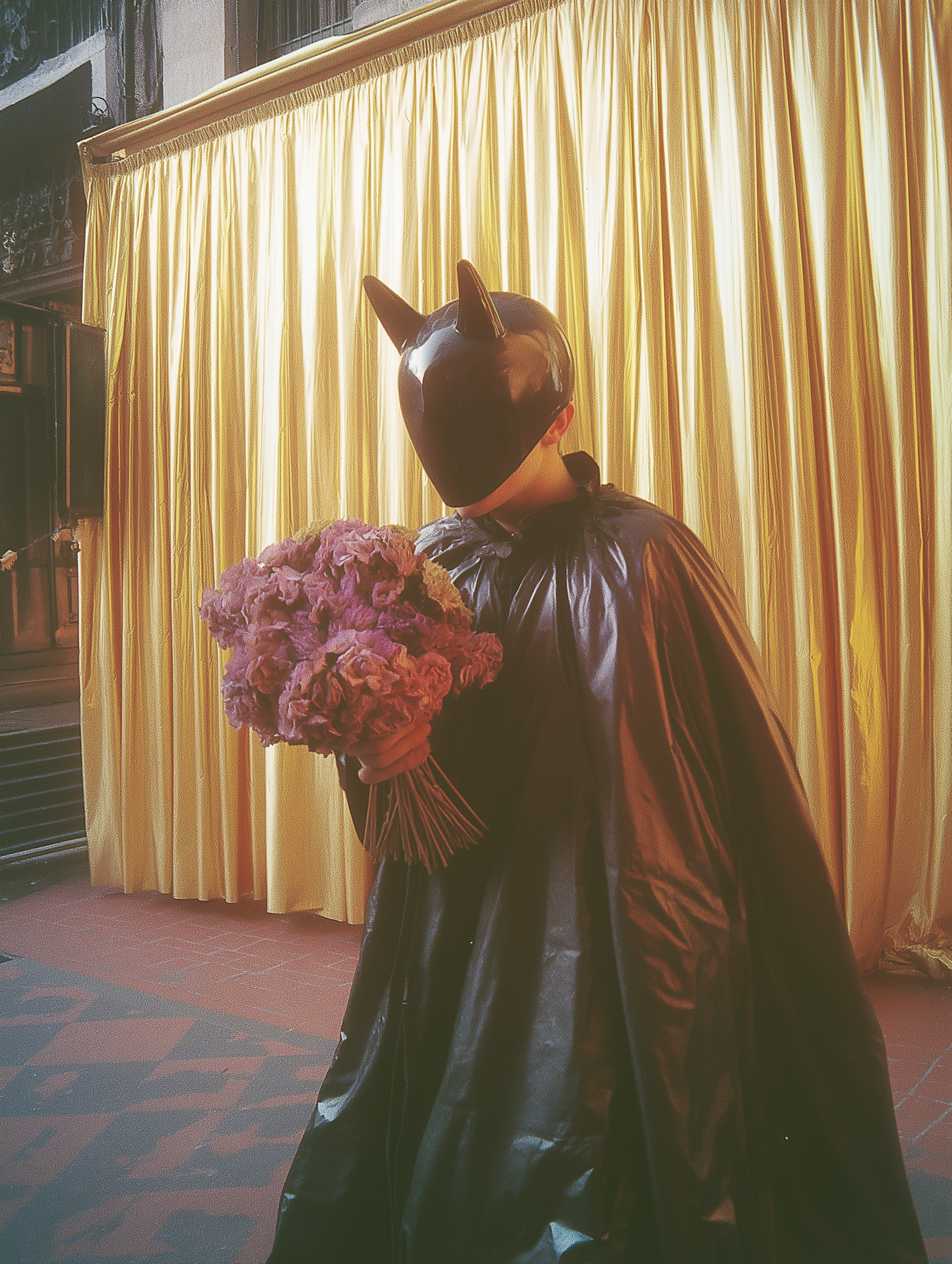 A person in a black costume and mask holds pink flowers against a golden curtain backdrop, creating a dramatic and artistic scene.