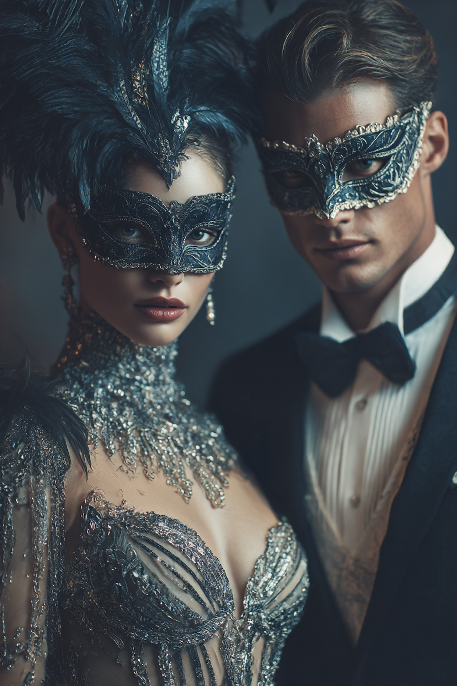 A couple in elegant masquerade attire, featuring intricate masks and luxurious outfits, captured in a dramatic and sophisticated setting.