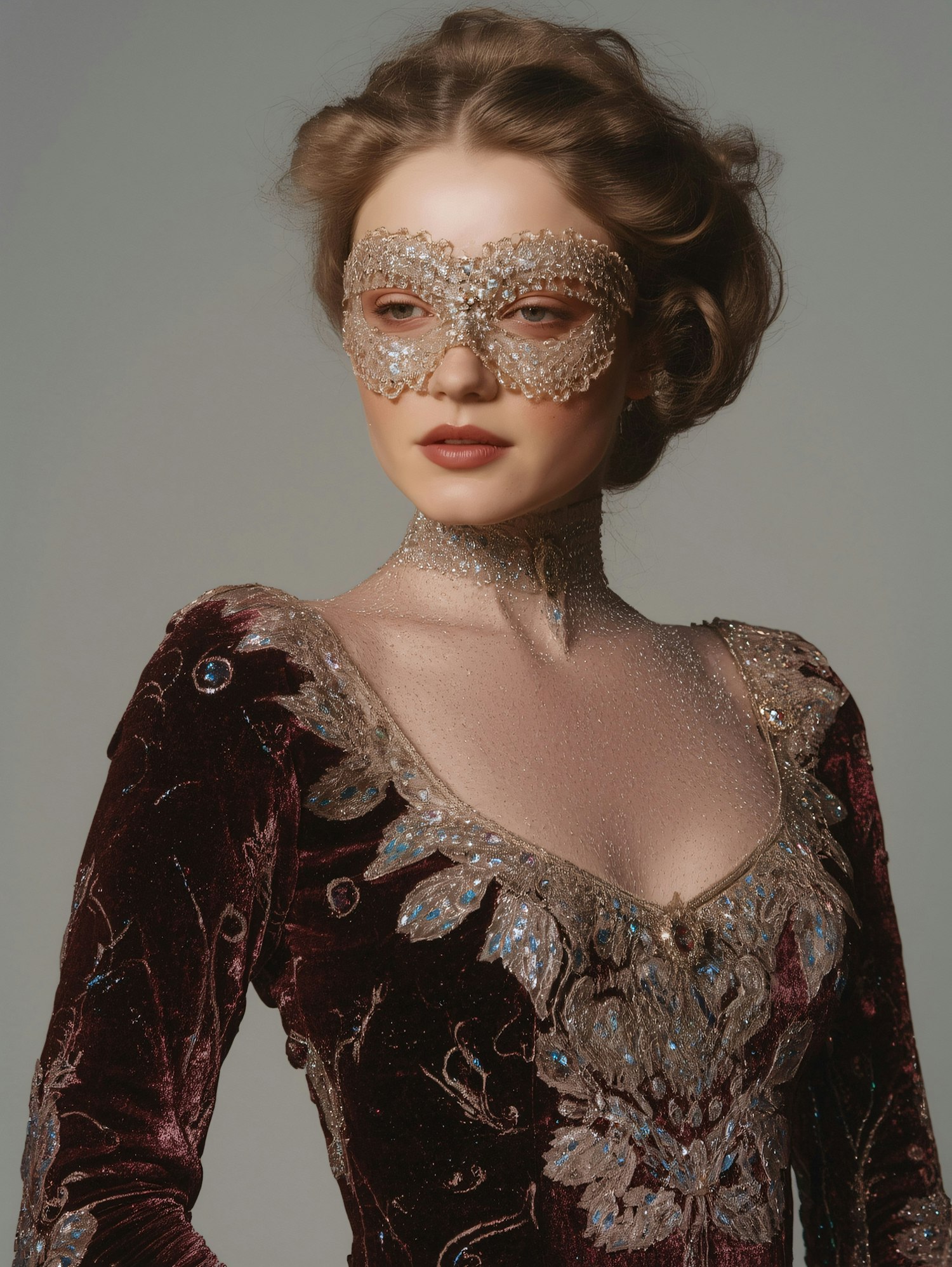 A woman in a detailed velvet gown and jeweled mask, styled for a masquerade, exudes elegance and mystery against a neutral backdrop.