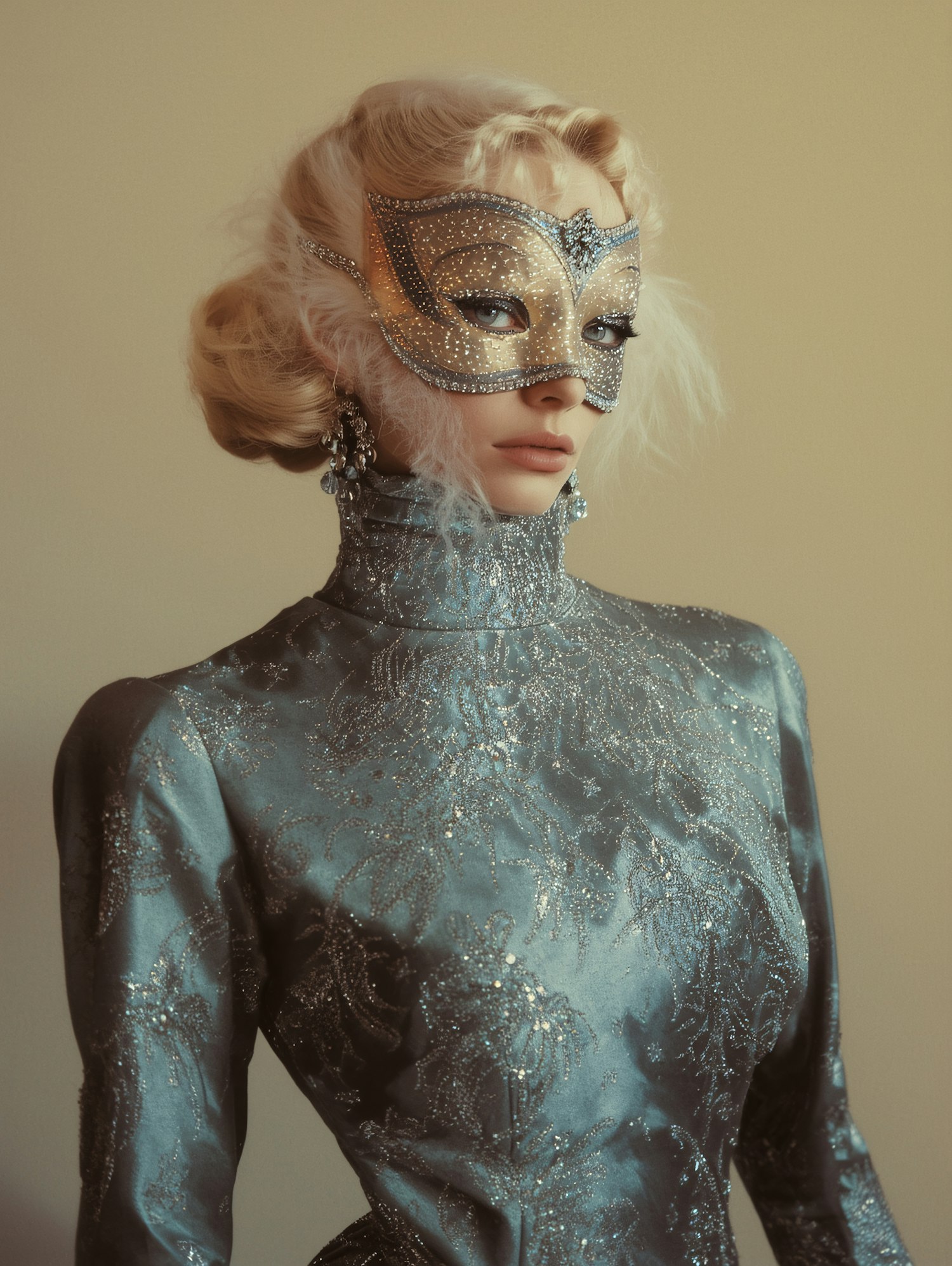 Elegant individual in a shimmering gown and ornate silver mask, embodying a mysterious and sophisticated masquerade theme.