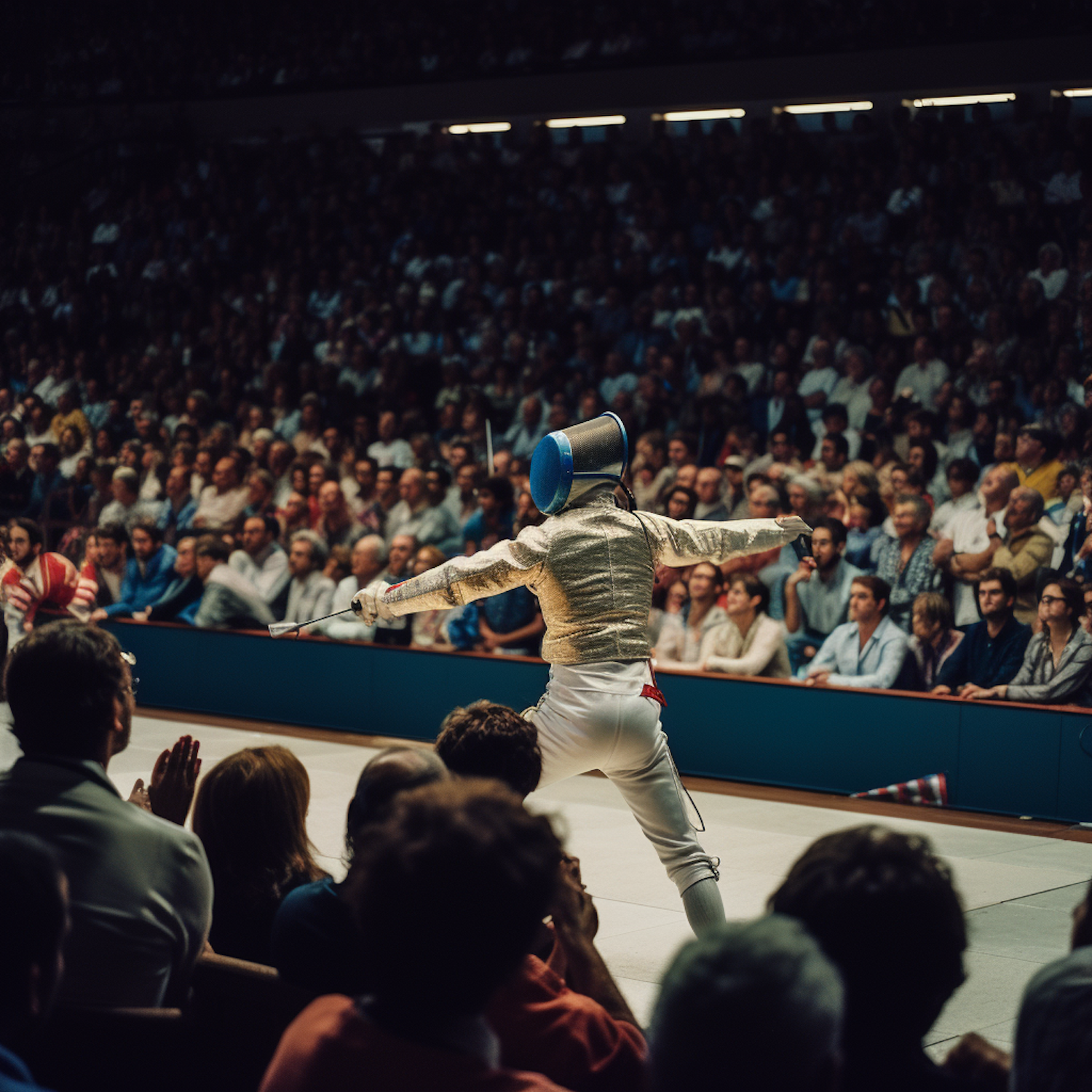 Dynamic fencing match with a focused fencer in action, captivating a large audience in a vibrant, energetic atmosphere.