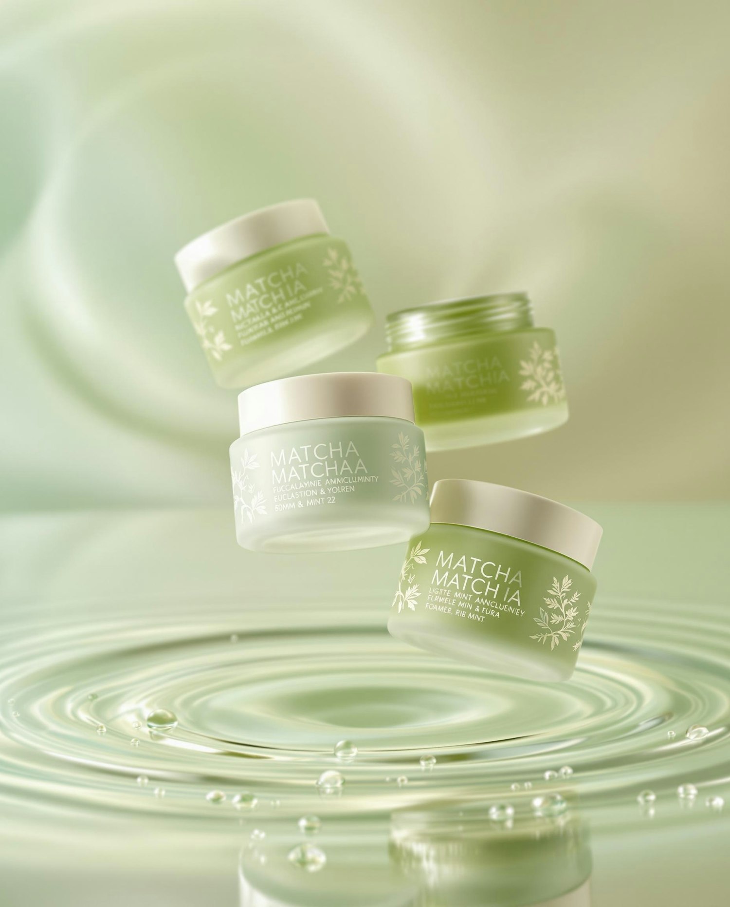 Floating green cosmetic jars labeled 'Matcha Matcha' over rippling water, evoking freshness and natural beauty in a serene green setting.