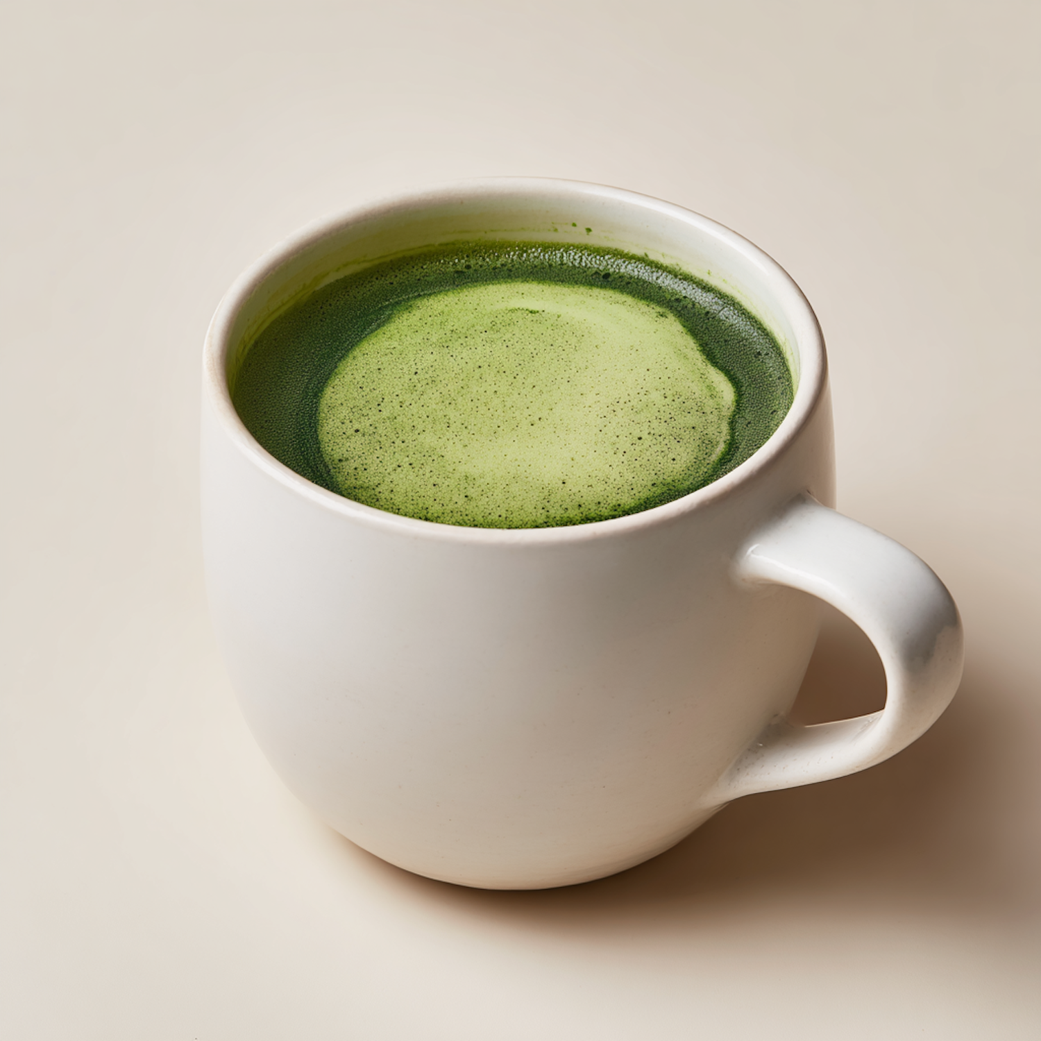 A white ceramic mug filled with a vibrant green matcha latte, showcasing its smooth and frothy surface on a neutral background.