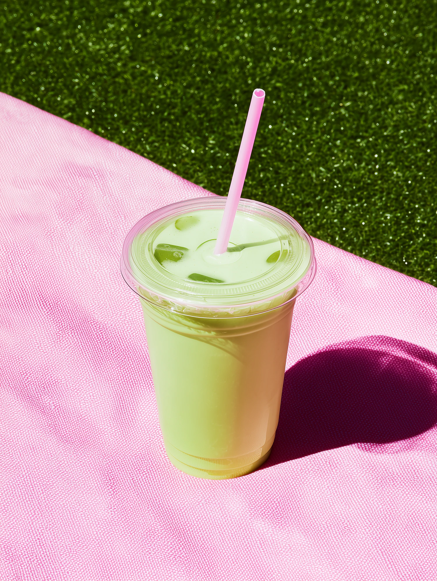 A refreshing green iced matcha latte in a clear cup with a pink straw, set against a pink surface and green grass background.
