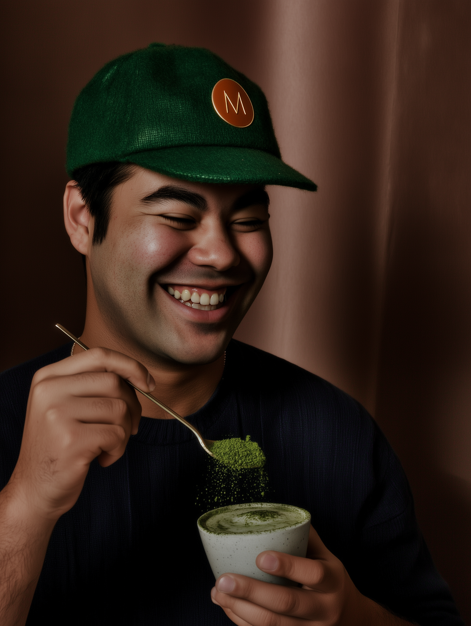 A smiling person in a green cap sprinkles matcha powder into a cup of frothy tea, set against a warm, softly lit background.