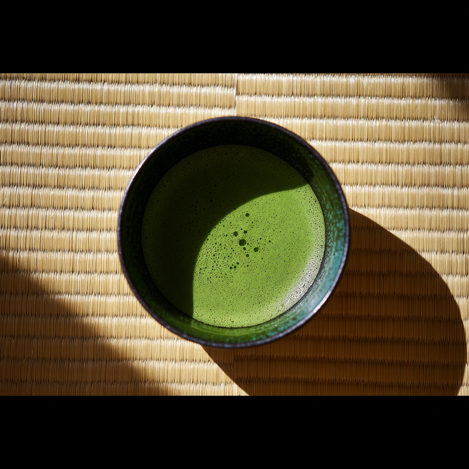 A bowl of matcha tea on a tatami mat, with sunlight casting shadows, showcasing traditional Japanese aesthetics.