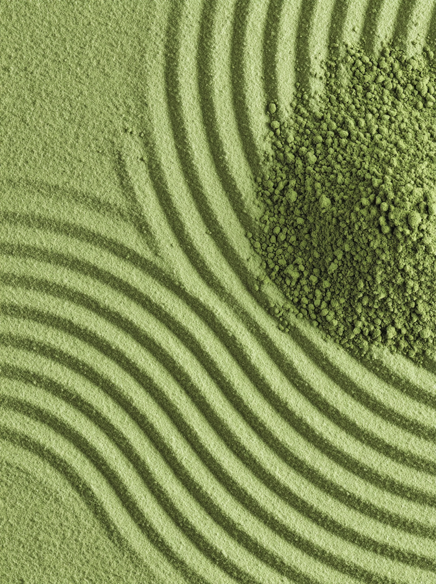 Close-up of green matcha powder with raked lines and a small mound, resembling a Zen garden. Vibrant and textured, perfect for tea lovers.