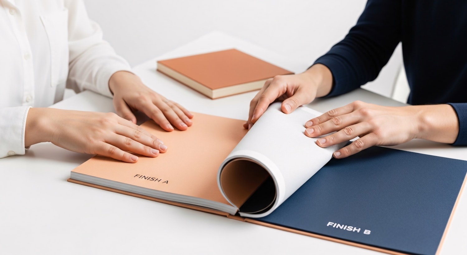 Two people reviewing a material sample book with labeled finishes, showcasing texture options on a clean, white table.