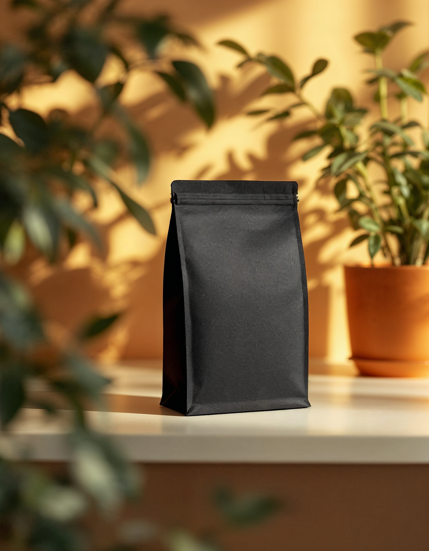 Sleek black bag on a sunlit surface, surrounded by lush green plants and warm terracotta pot. Elegant and serene composition.