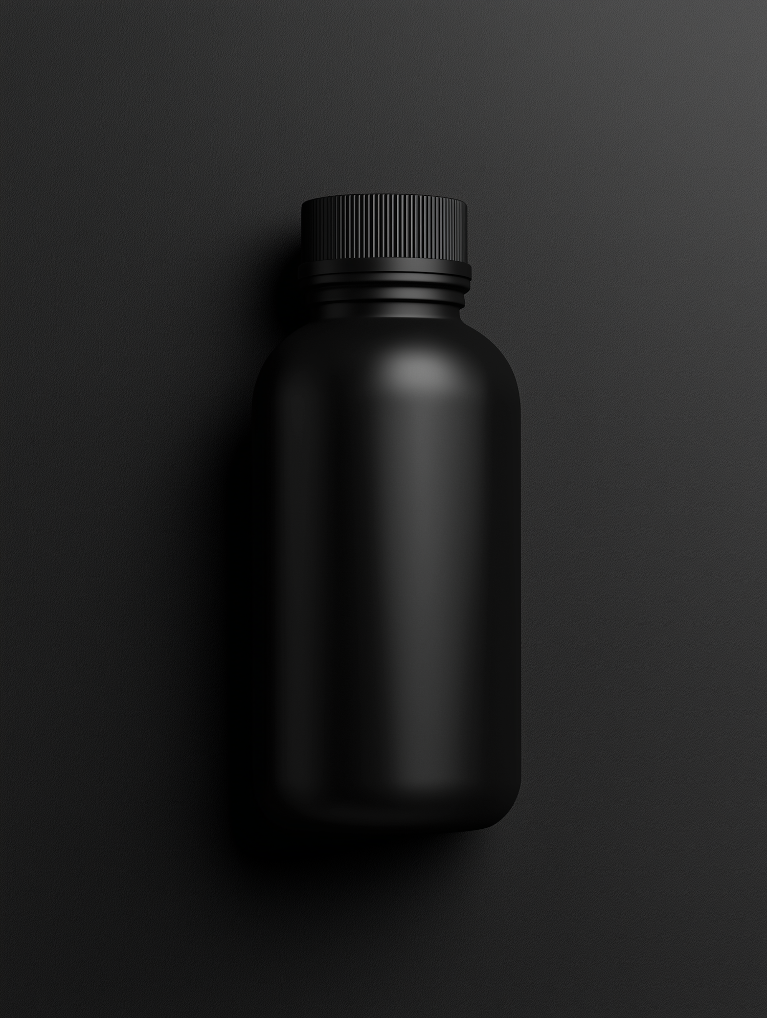 Minimalist matte black bottle with ribbed cap on a dark background, perfect for modern product branding or packaging concepts.