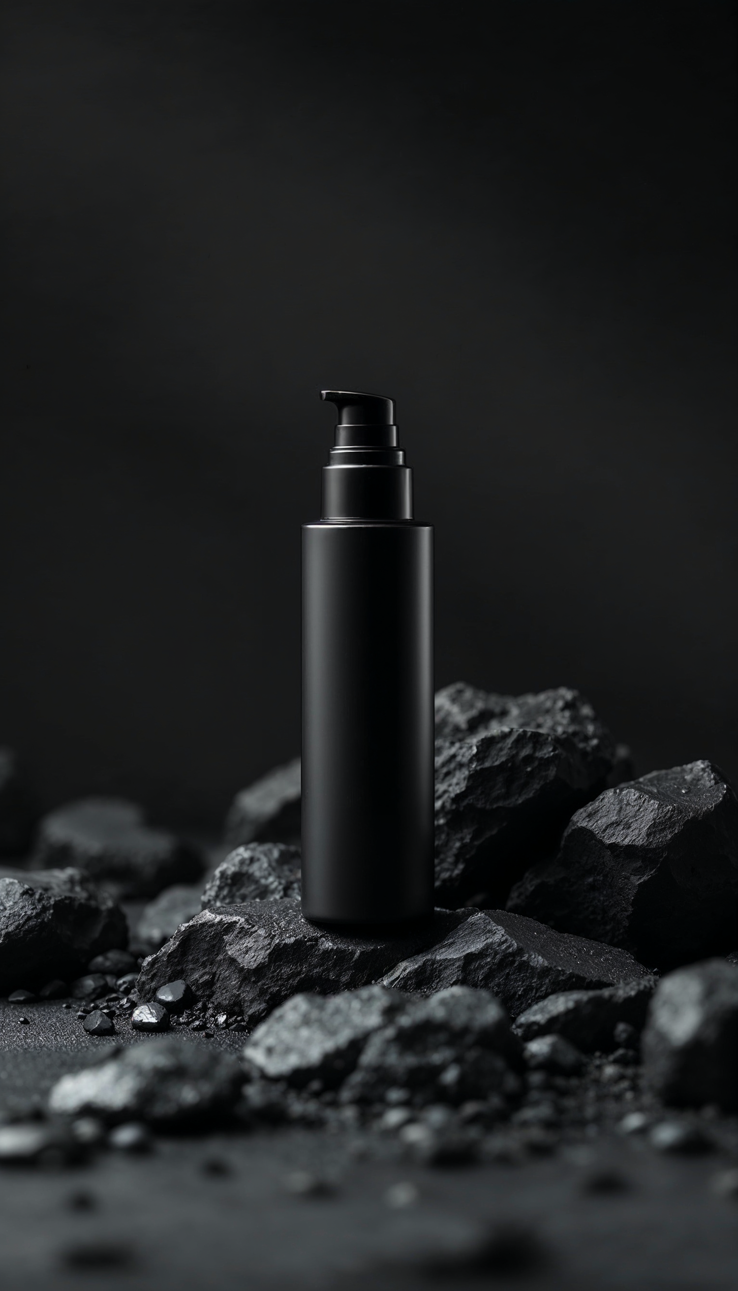 Sleek black bottle with pump on dark rocky background, highlighting minimalist design and elegance.