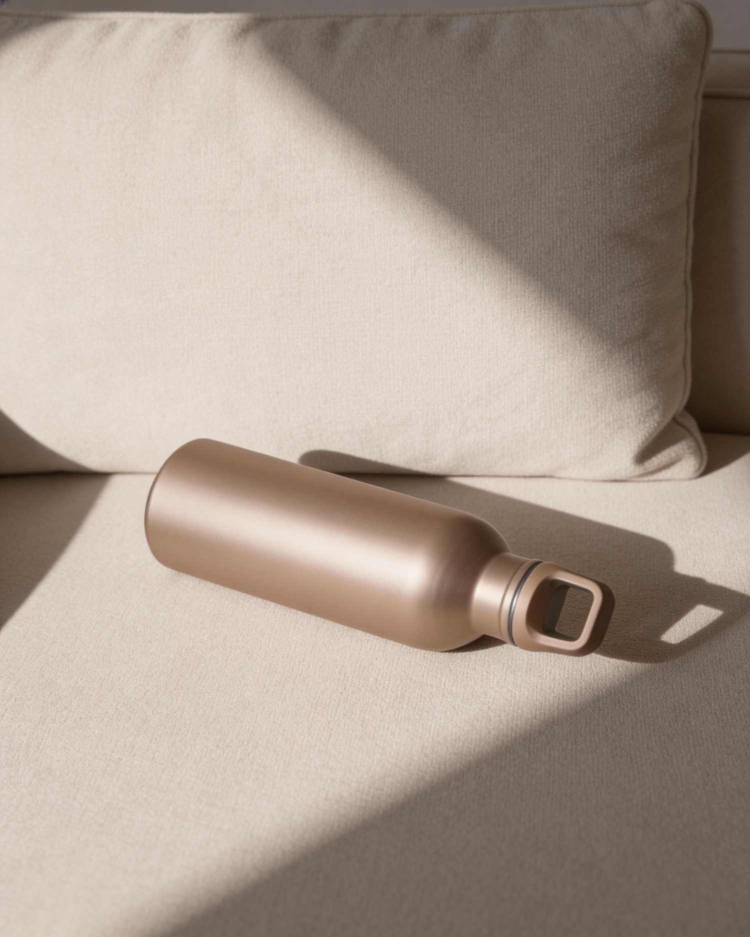 A stylish matte gold water bottle on a beige fabric surface, bathed in soft natural light, creating a minimalist and warm aesthetic.