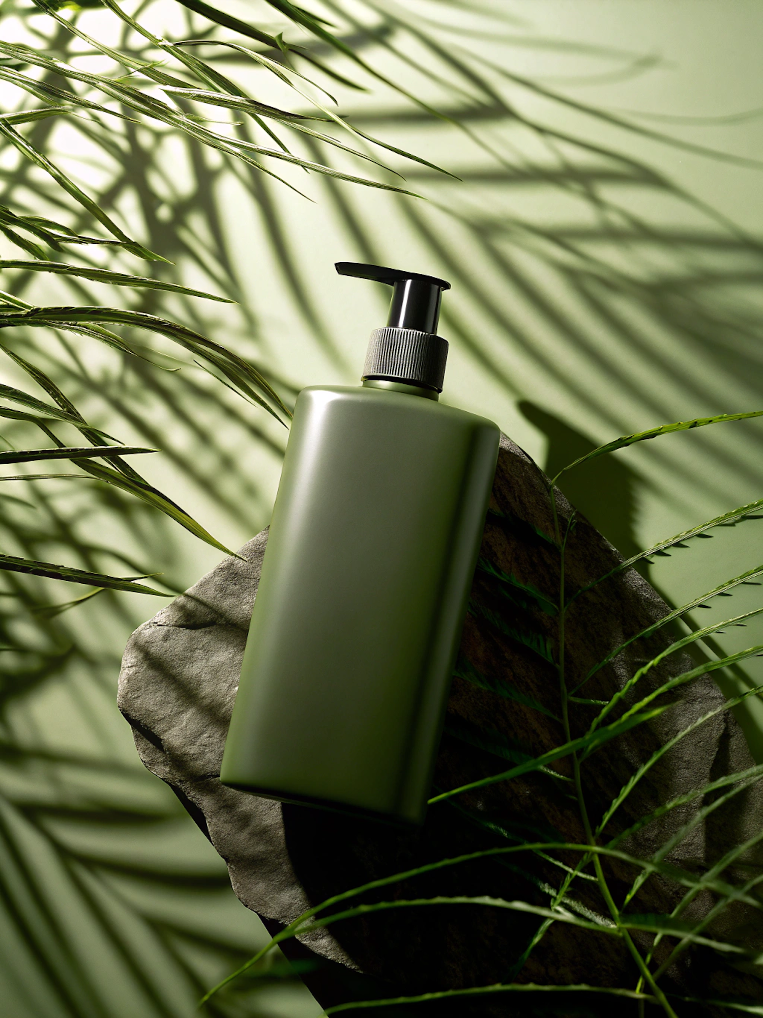 Minimalist green bottle with black pump on a stone slab, surrounded by leaves and soft shadows, evoking a natural and eco-friendly vibe.