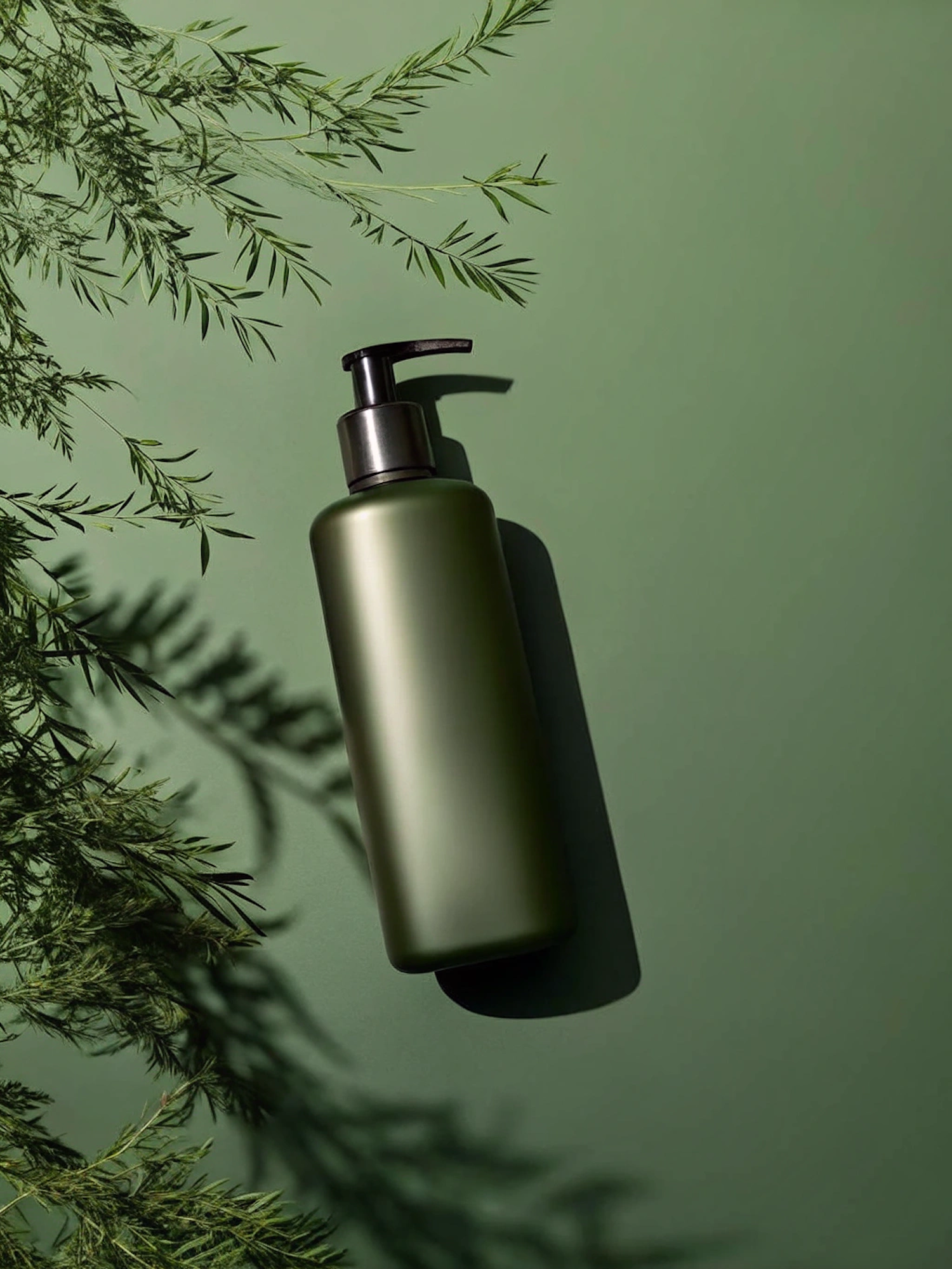 Minimalist green pump bottle on a green background with foliage shadows, evoking a natural and eco-friendly aesthetic.