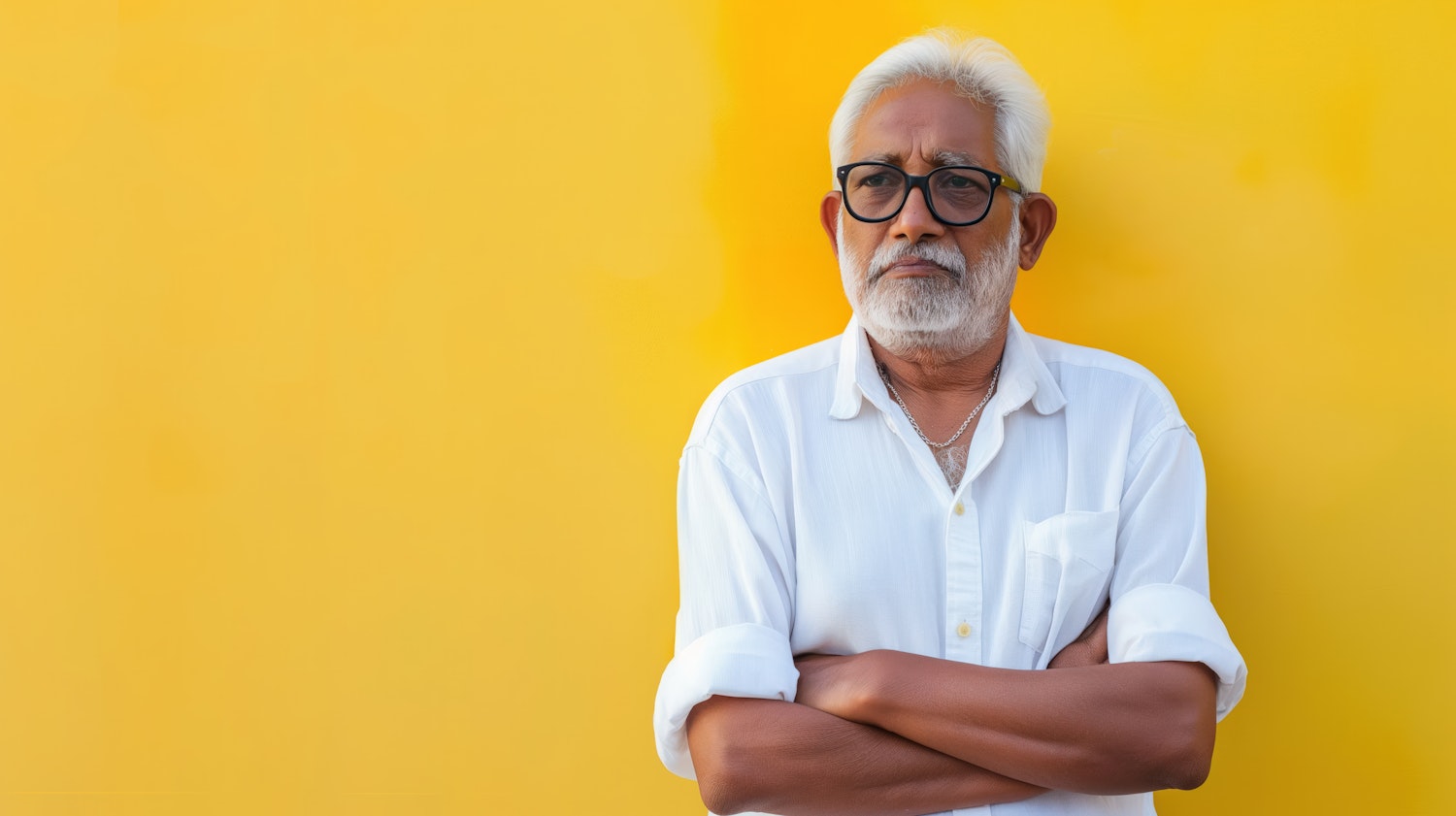 Confident older man with white hair and beard, wearing glasses and a white shirt, stands against a vibrant yellow background.