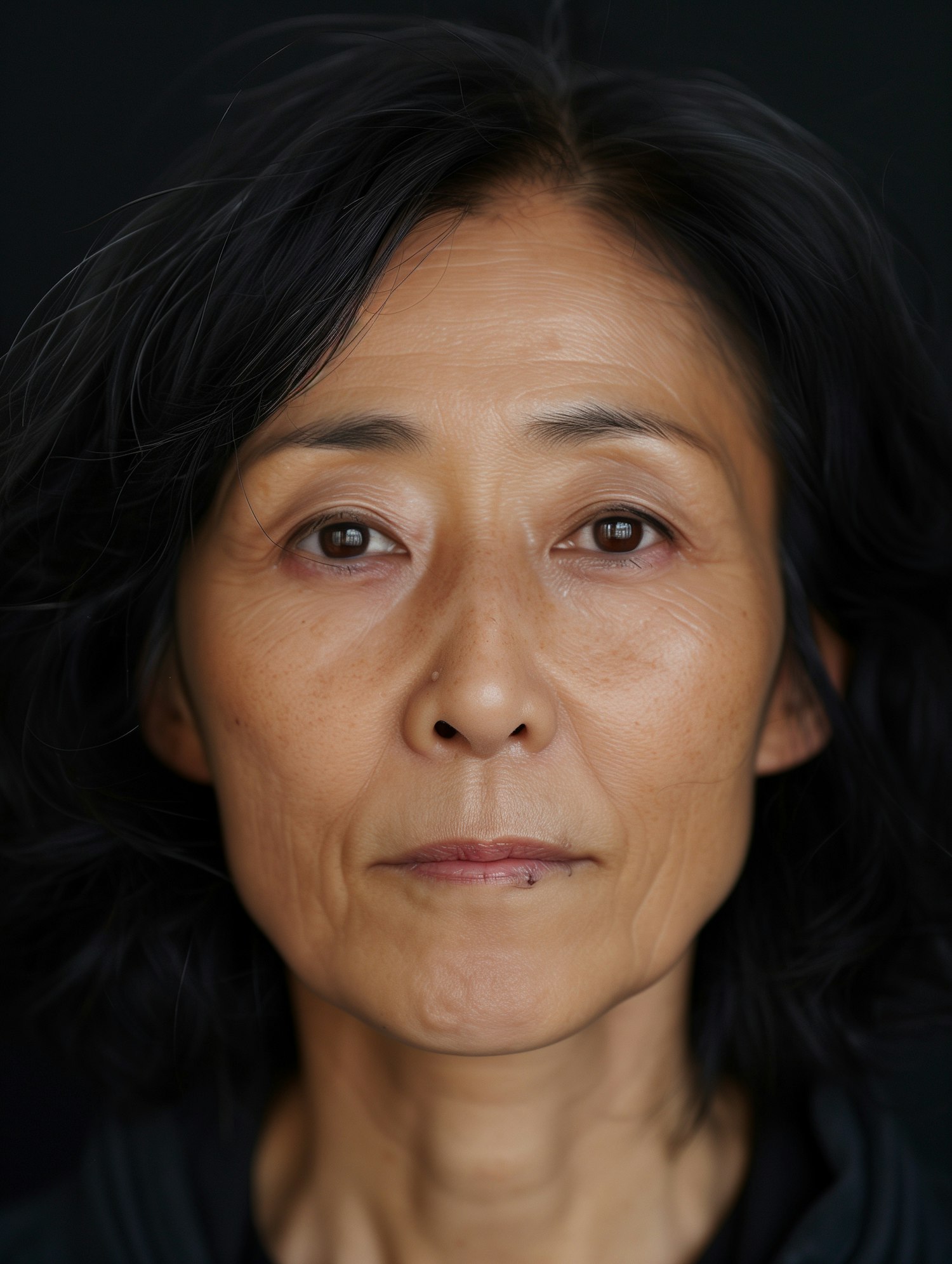 Portrait of a middle-aged Asian woman with dark hair and calm expression against a dark background.