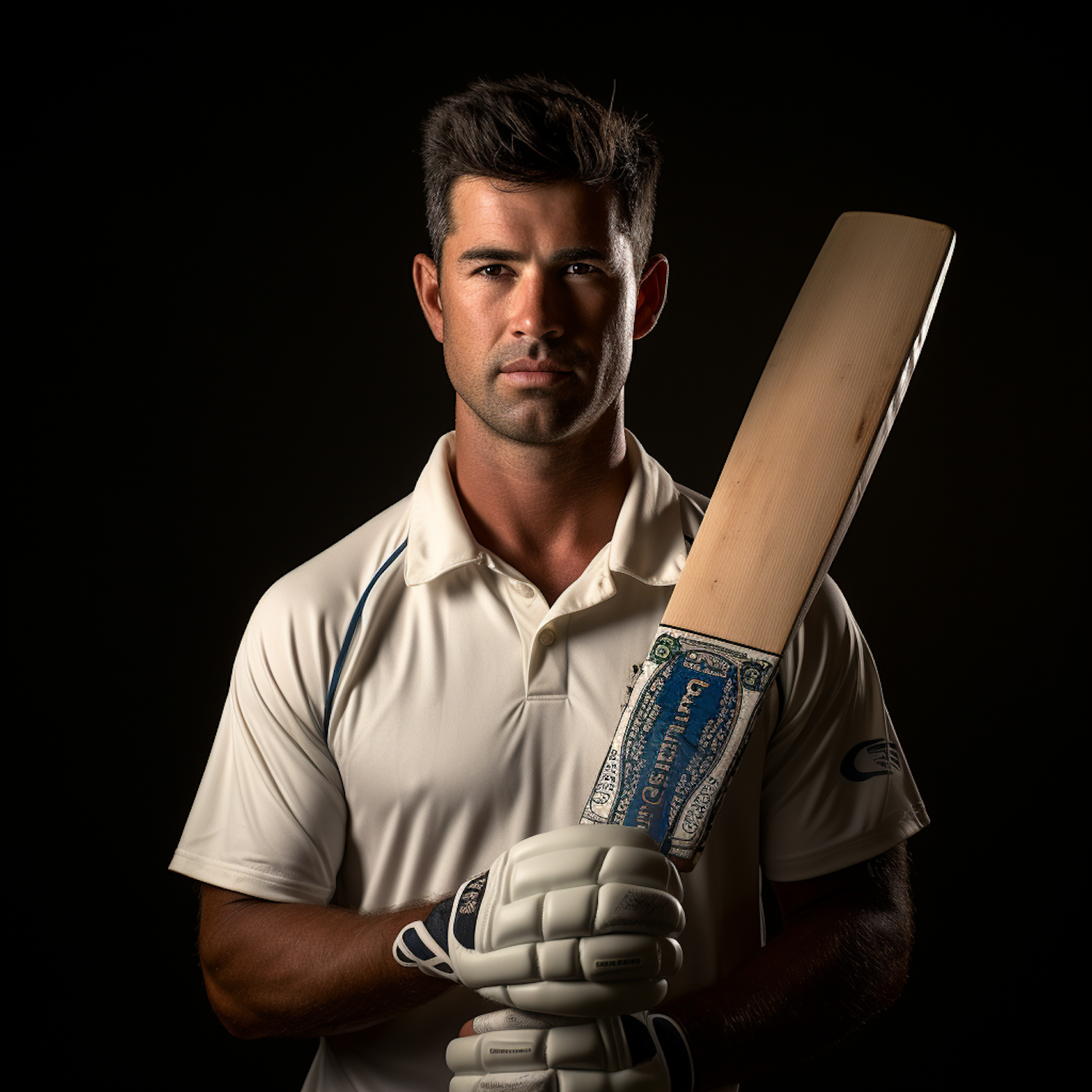 Cricket player in white uniform holding a bat, with a blurred face, set against a dark background for a dramatic effect.