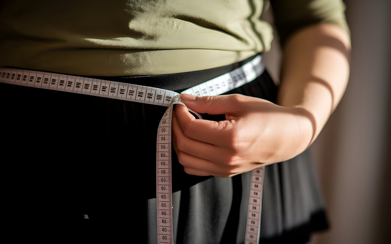 Close-up of a person measuring their waist with a white tape, wearing a green top and black skirt, in soft natural lighting.