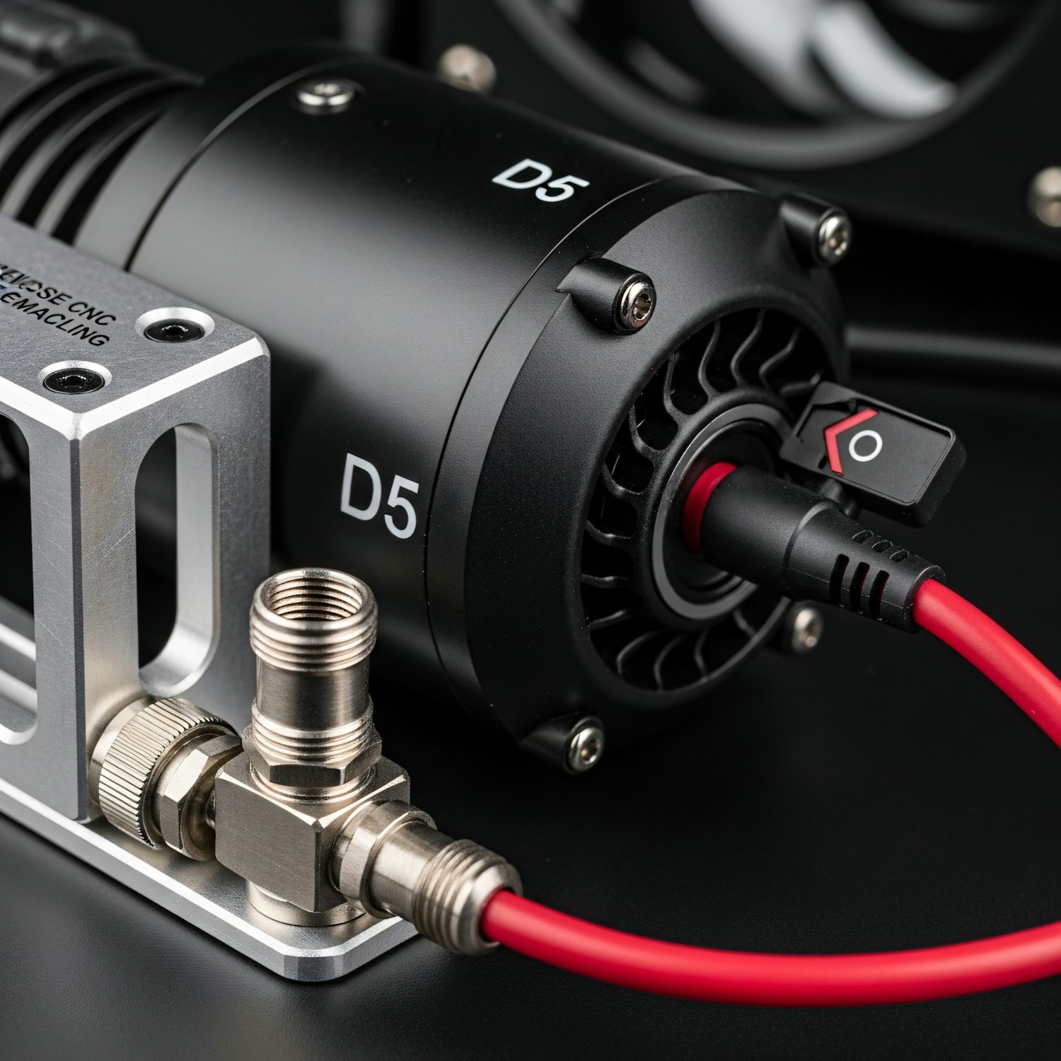 Close-up of a D5 pump assembly with a red cable and metallic fittings, showcasing precision engineering and industrial design.