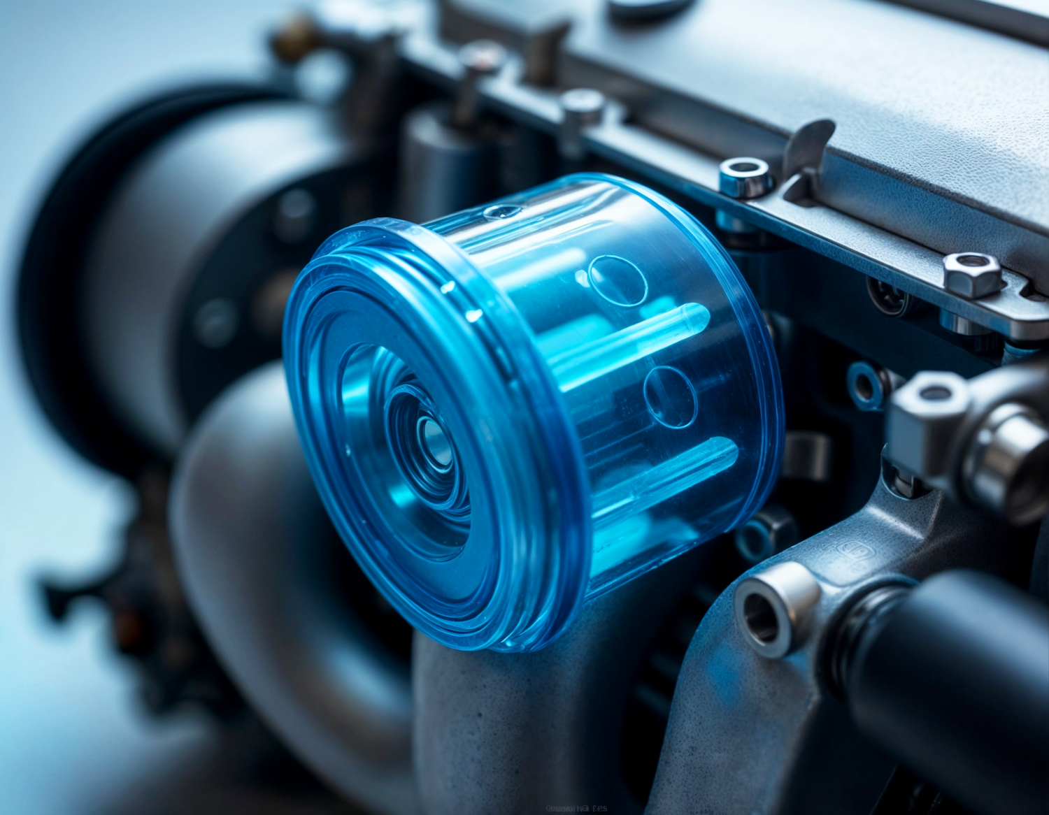 Close-up of a mechanical component with a transparent blue cylinder, showcasing intricate metal design and industrial aesthetics.