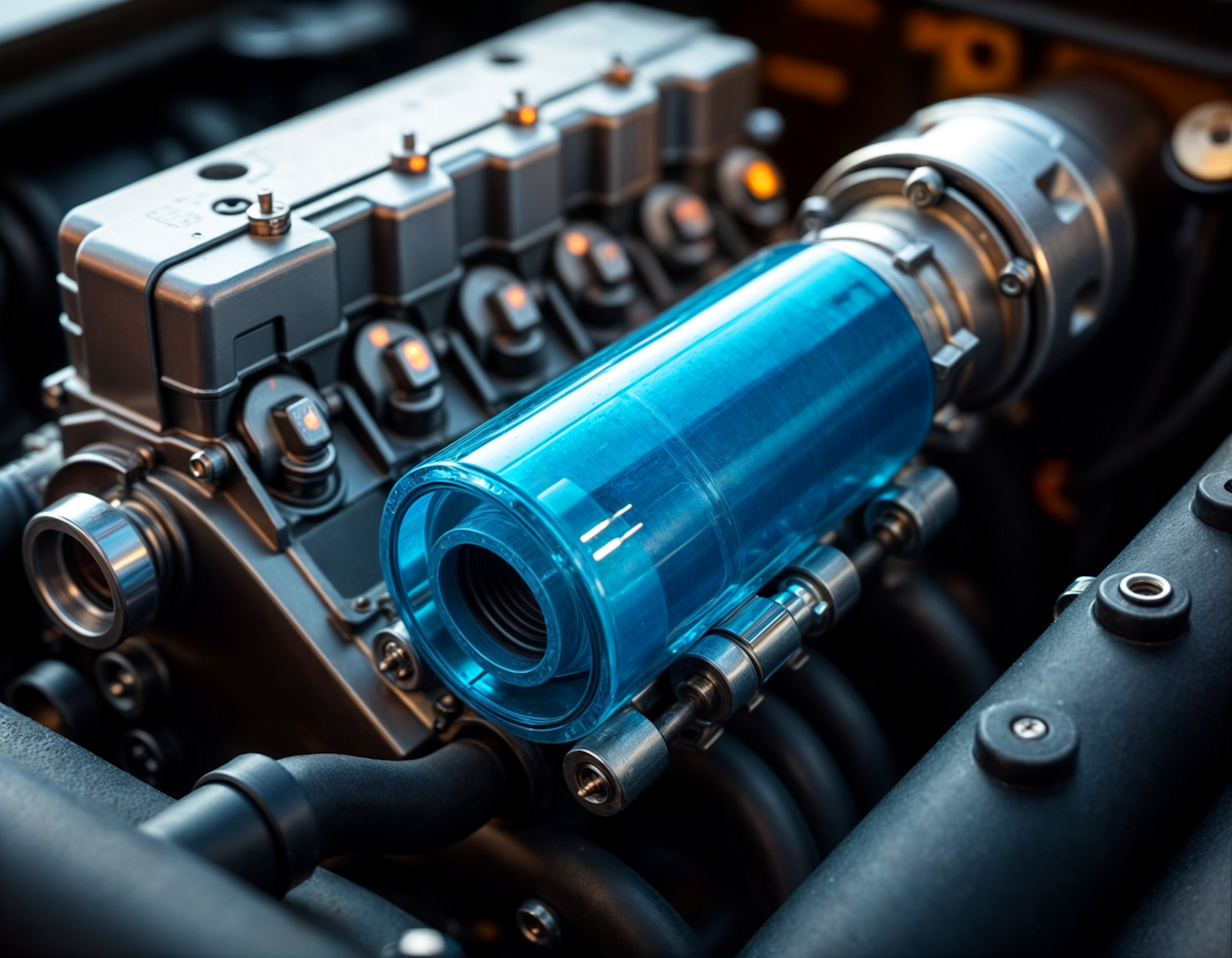 Close-up of a car engine with a striking blue cylindrical component, highlighting intricate mechanical details.