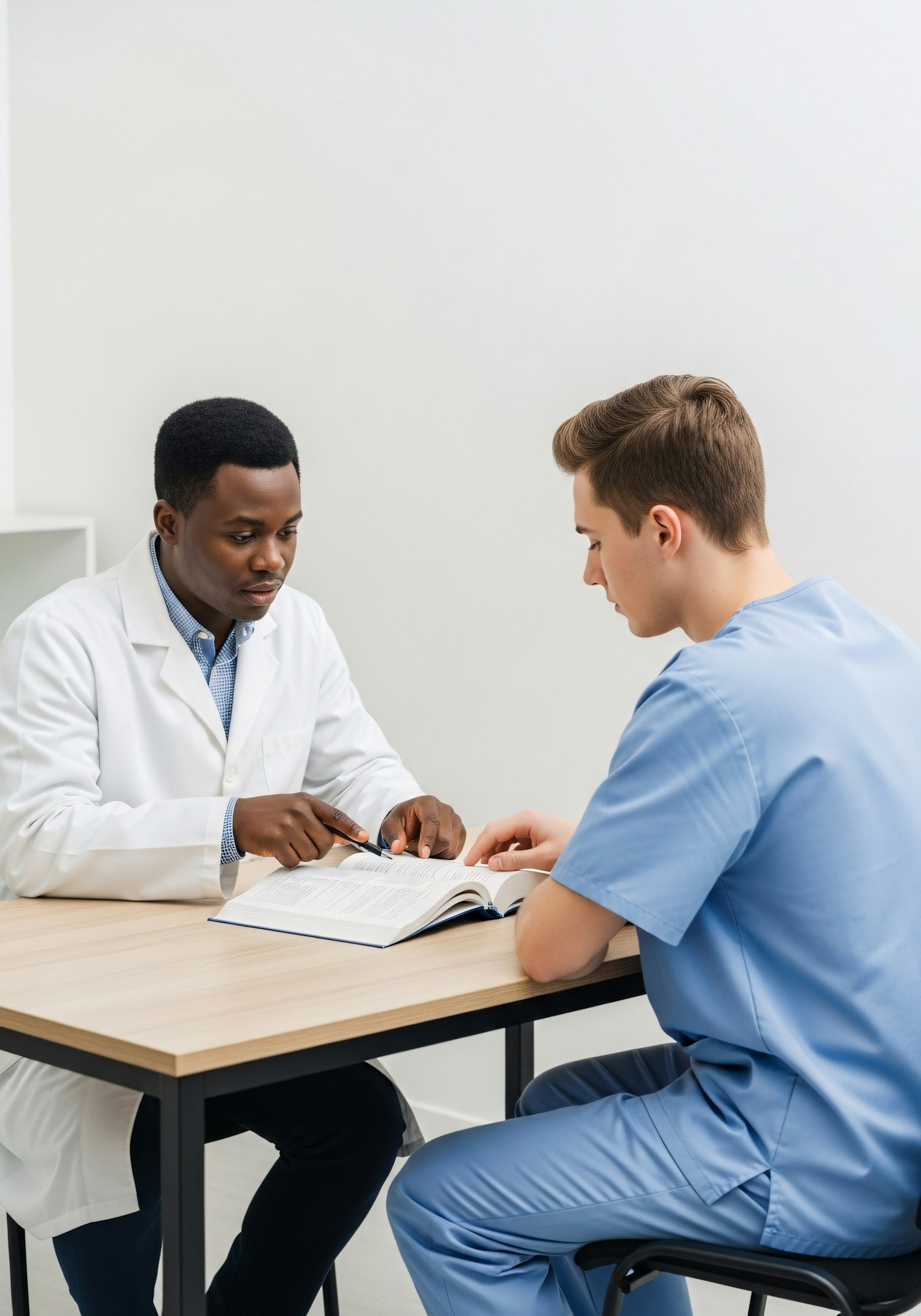 A professional discussion between two individuals, one in a lab coat and the other in scrubs, collaborating over an open book.