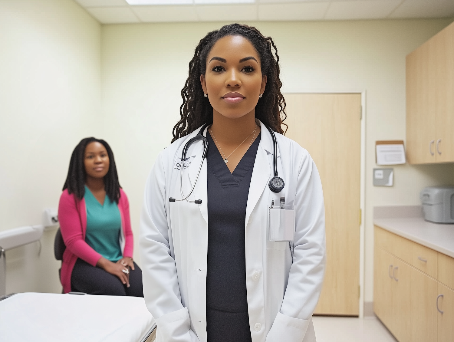 Confident Black female doctor with stethoscope in a bright exam room, patient seated in background. Professional healthcare setting.
