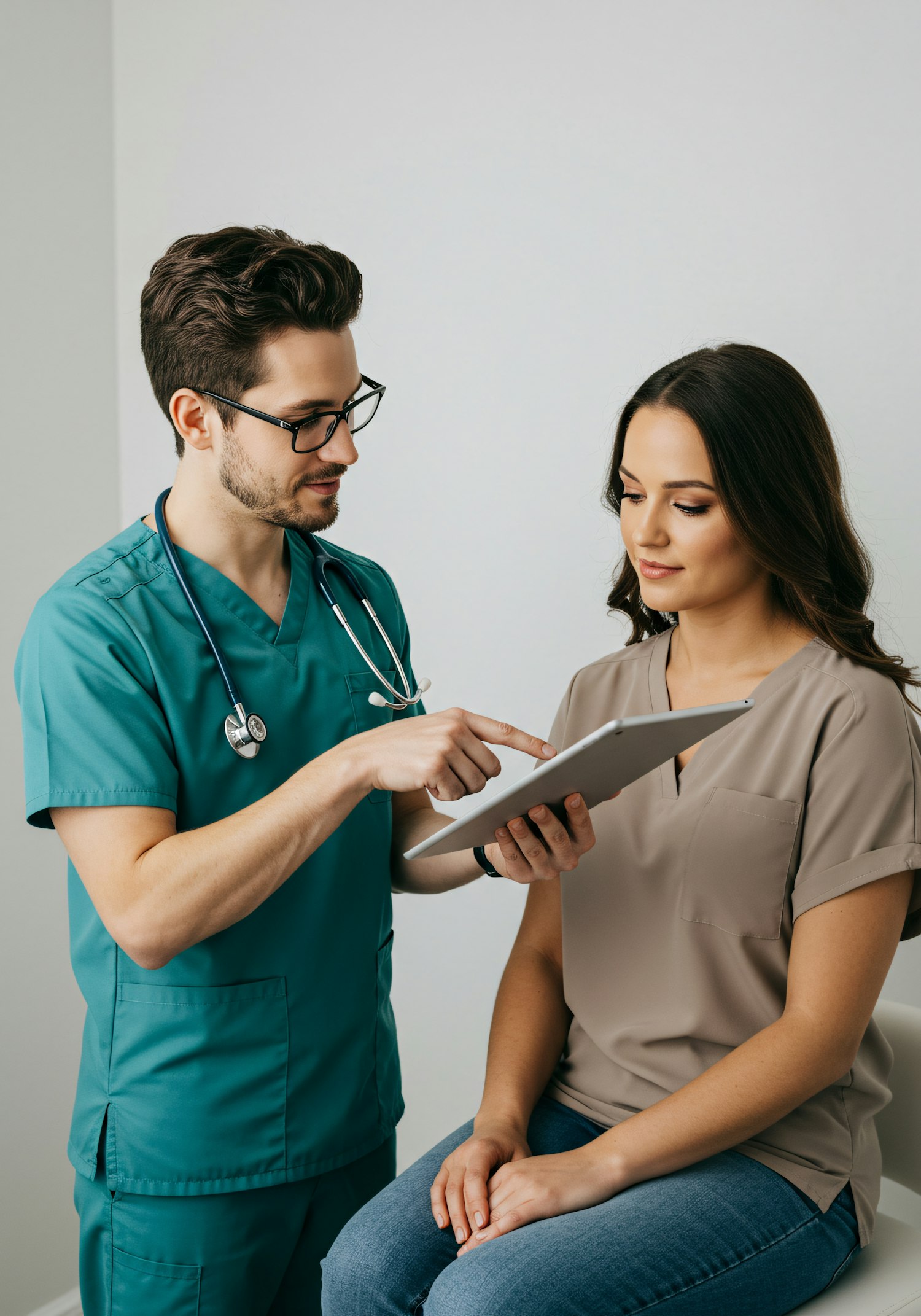 A healthcare professional in teal scrubs discusses information on a tablet with a seated woman in a beige top in a clinical setting.
