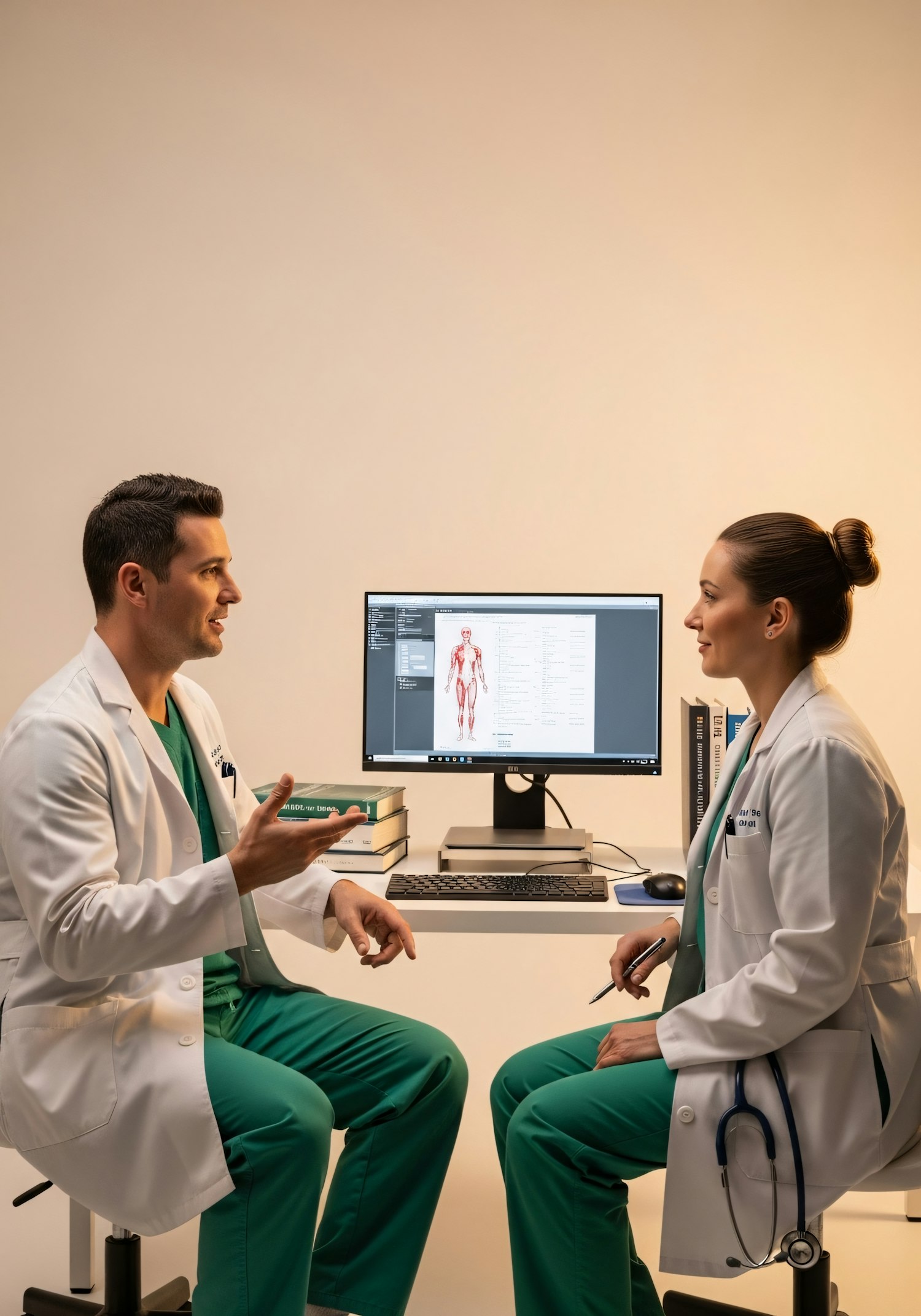Two medical professionals in lab coats discuss anatomy at a desk with a computer and books, creating a professional and academic scene.