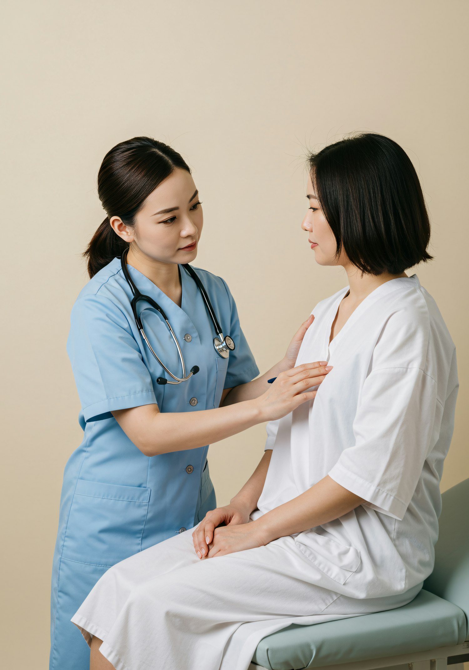 A healthcare professional examines a patient in a clinical setting, showcasing care and attentiveness in a neutral background.