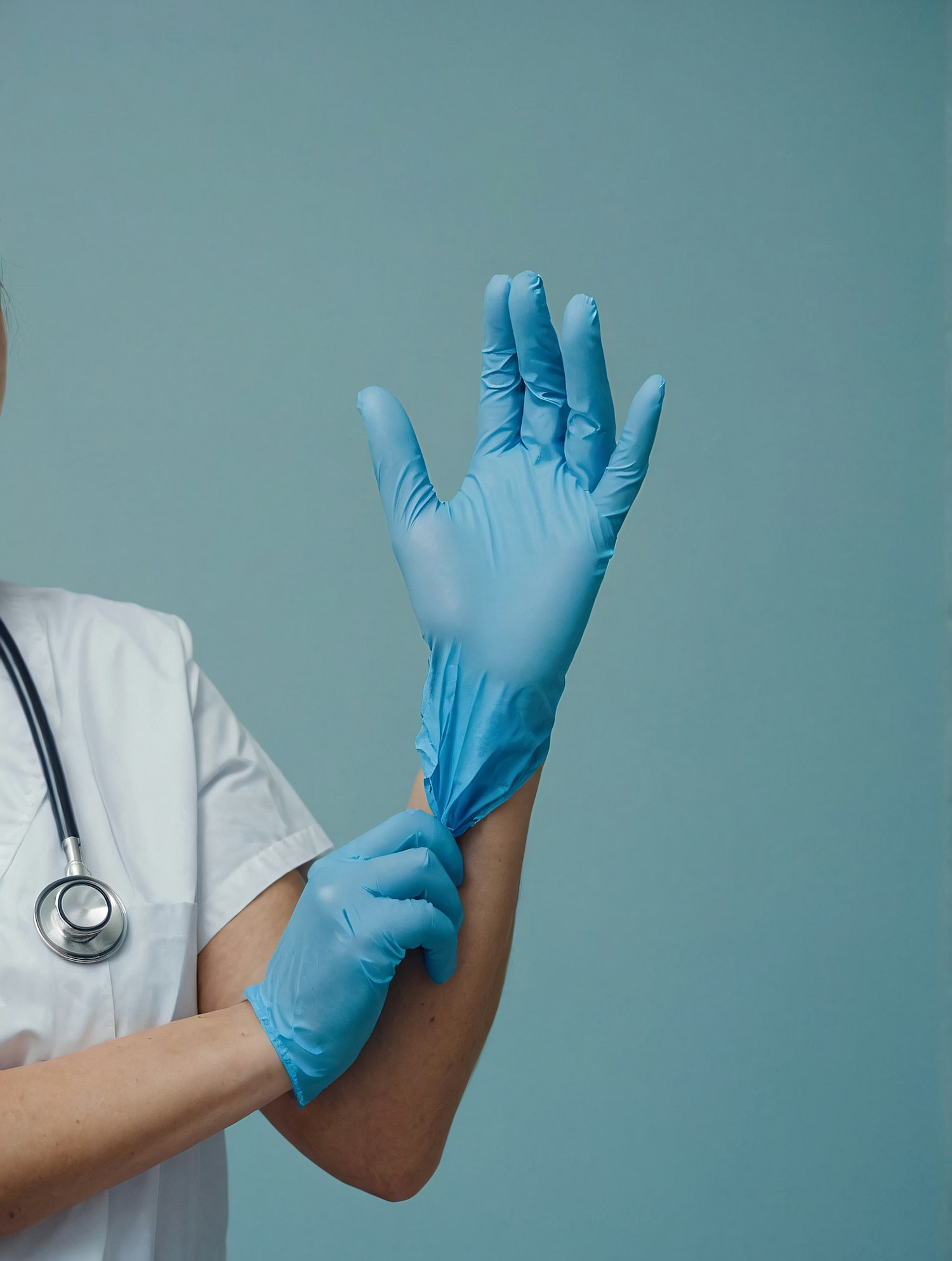 Healthcare worker putting on blue gloves, wearing a white uniform and stethoscope, against a clean teal background.